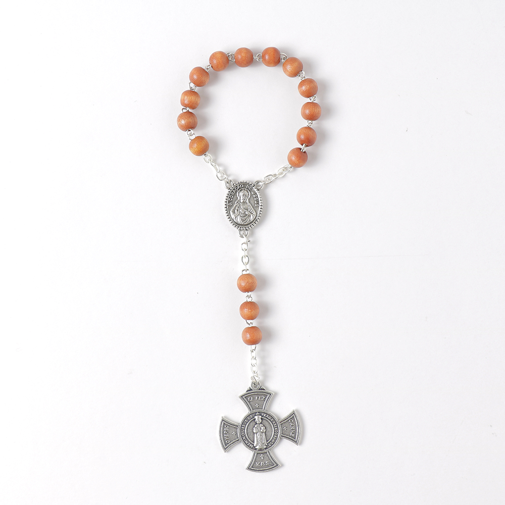 Coroinha Menino Jesus de Praga com 18cm, de cor castanha em madeira, com medalha da Nossa Senhora do Sameiro e no verso com medalha do Sagrado Coração de Jesus.