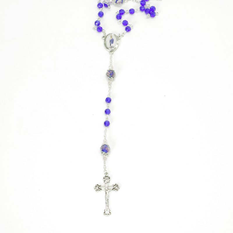Terço azul com rosas nas contas, e com a medalha da Nossa Senhora do Sameiro.