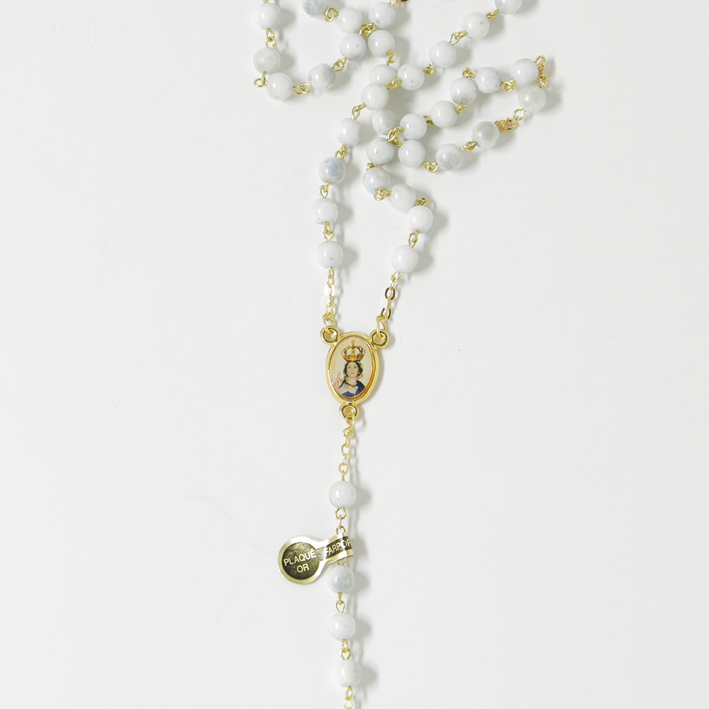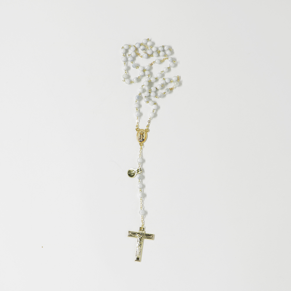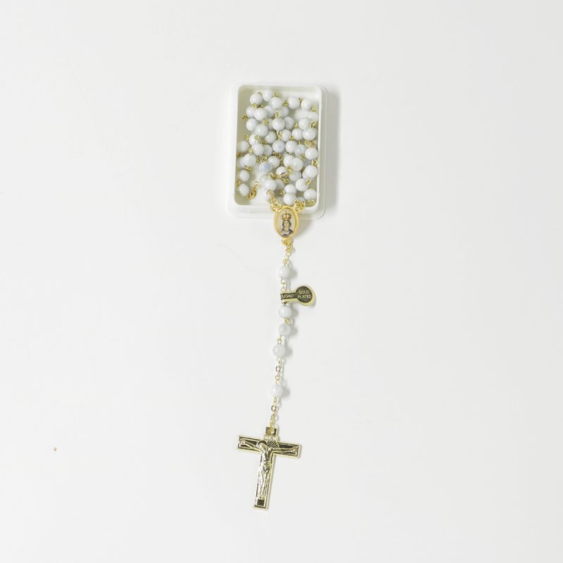 Terço branco com contas em vidro com a medalha da Nossa Senhora do Sameiro e cruz em dourado.