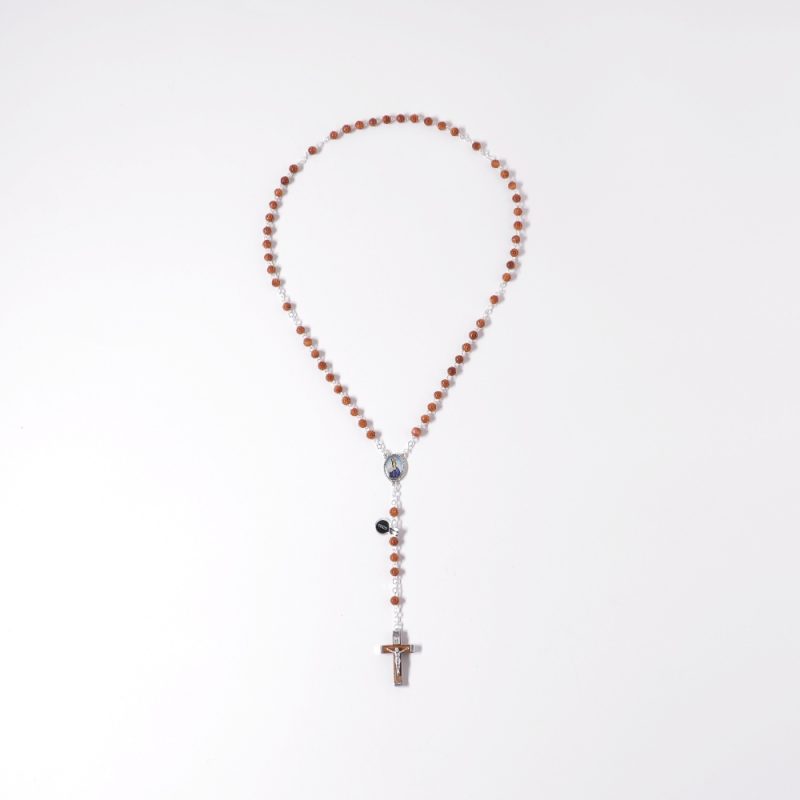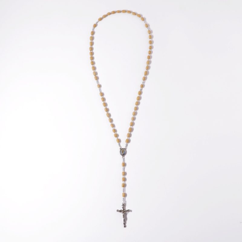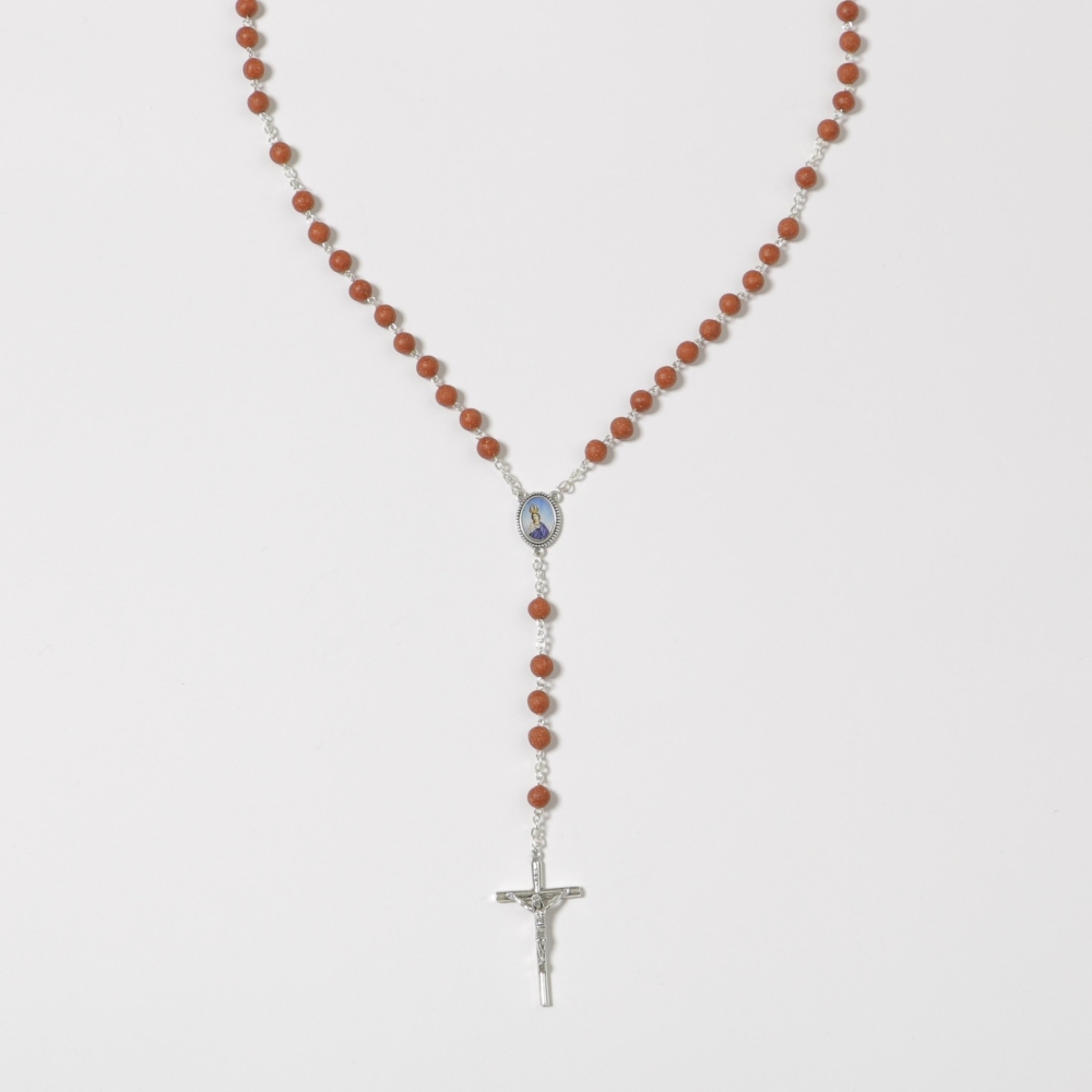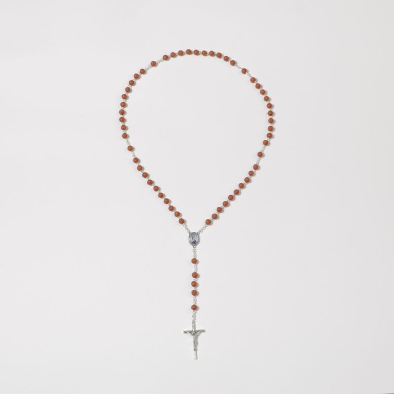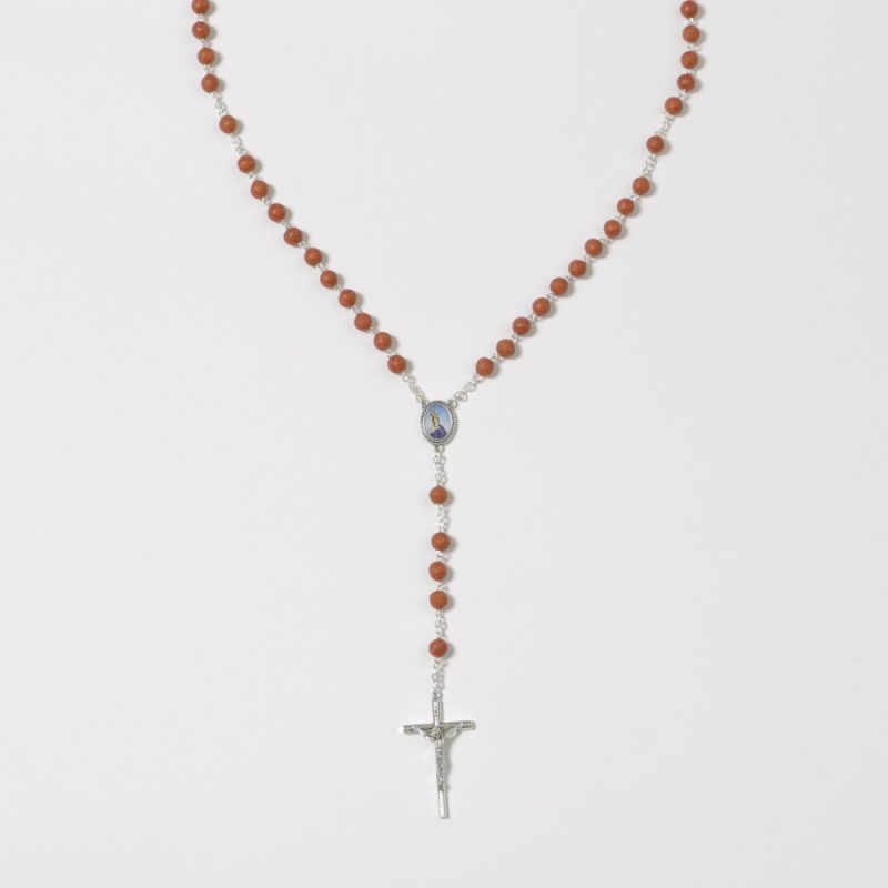 Terço com perfume de rosas, 49cm. Este terço é elaborado em madeira e com pétalas de rosas, daí o seu agradável perfume a rosas. Tem cruz prateada e a imagem da Nossa Senhora do Sameiro no passador.