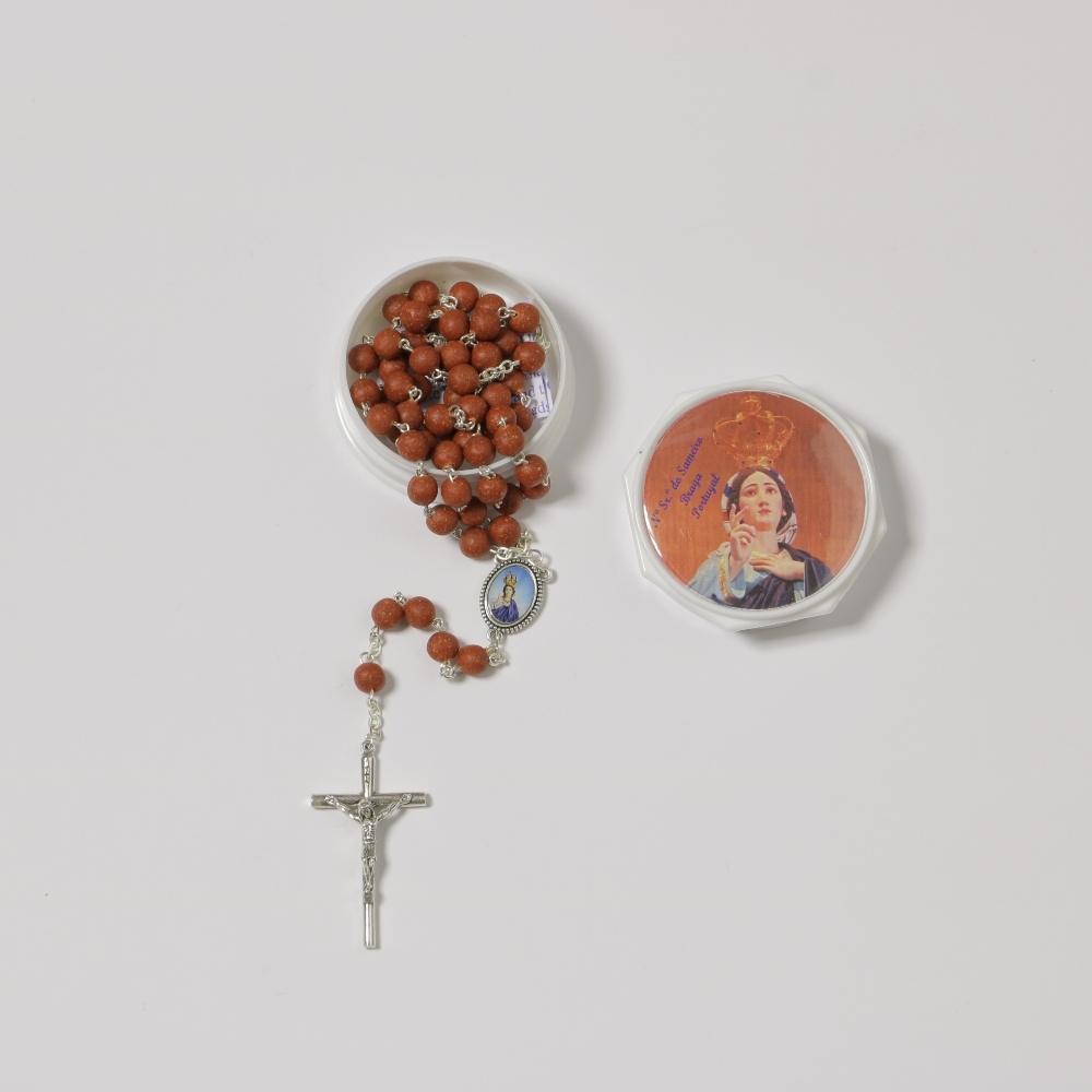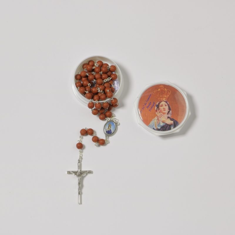 Acompanha uma caixa redonda com imagem da Nossa Senhora do Sameiro para guardar o terço e conservar o seu perfume.