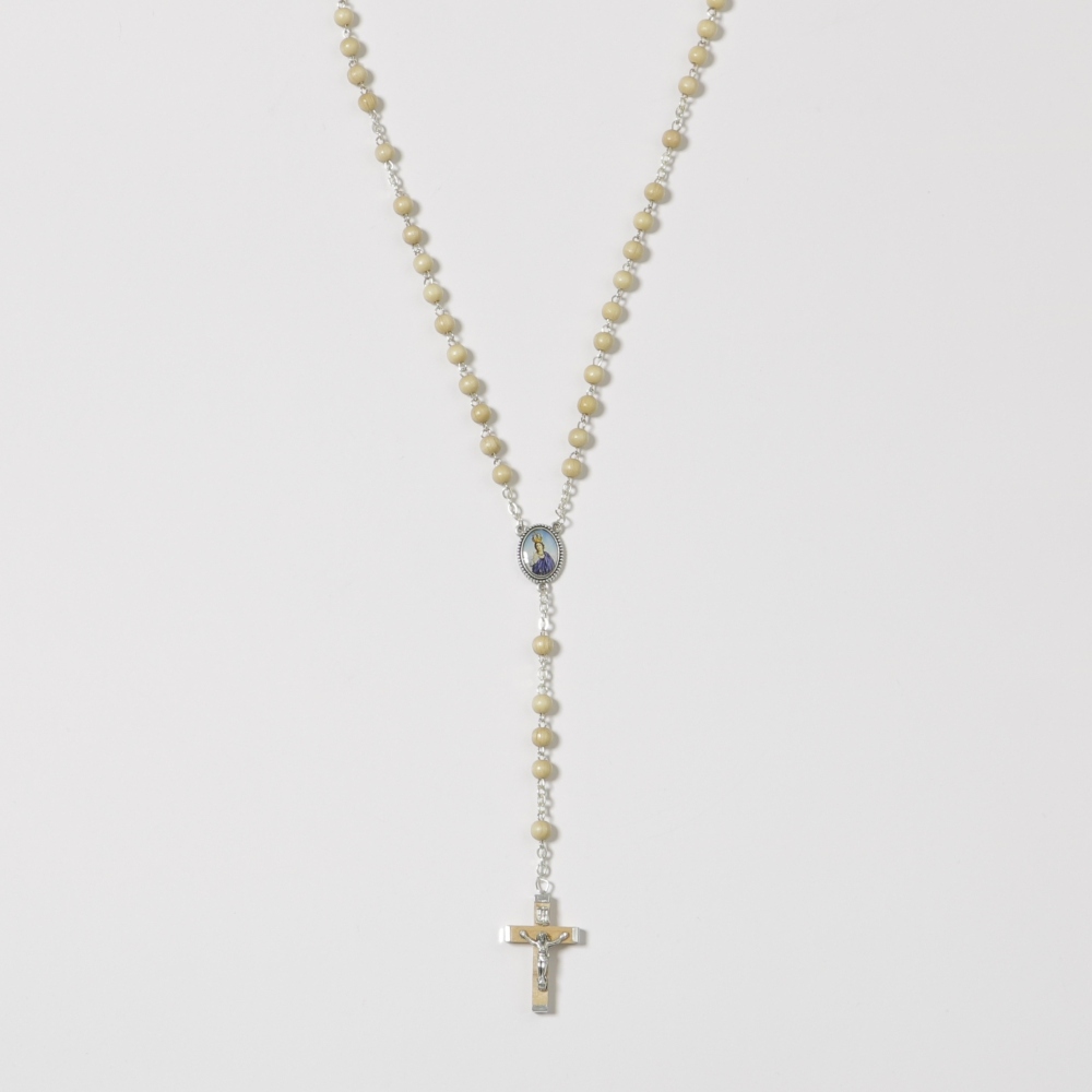 Terço com contas em madeira de oliveira, 57cm. Este terço muito bonito e elegante tem as contas em madeira castanho muito claro, medalha da Nossa Senhora do Sameiro no passador e cruz também em madeira com bordos em prata.