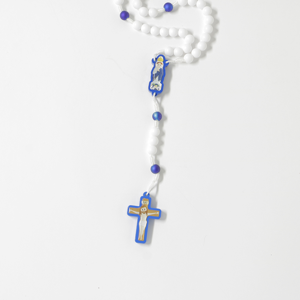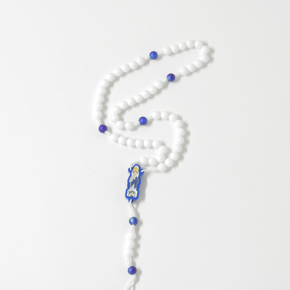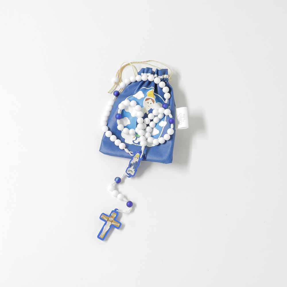 Terço infantil feito em plástico com corda, com a imagem da Nossa Senhora do Sameiro e cruz de cristo. Contém saco para guardar o terço.