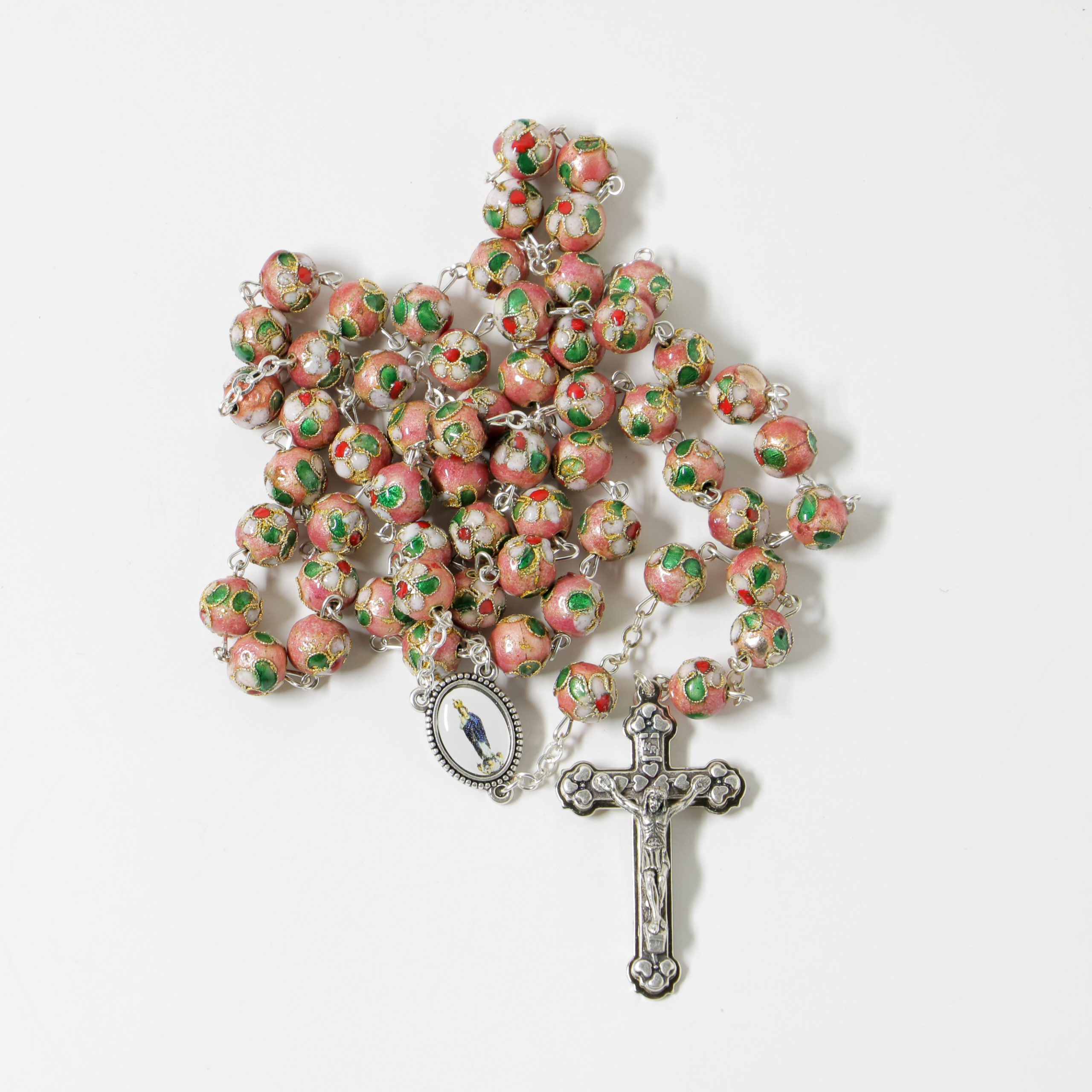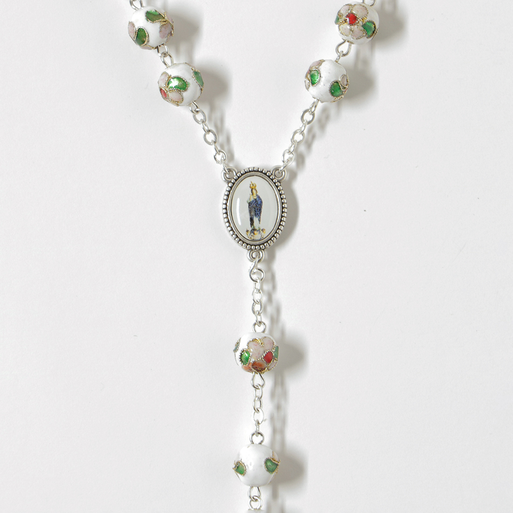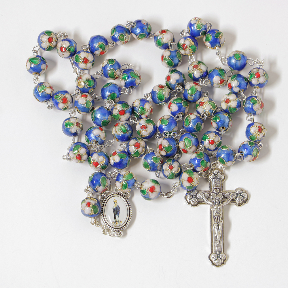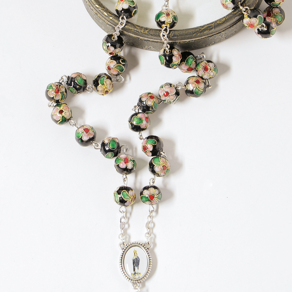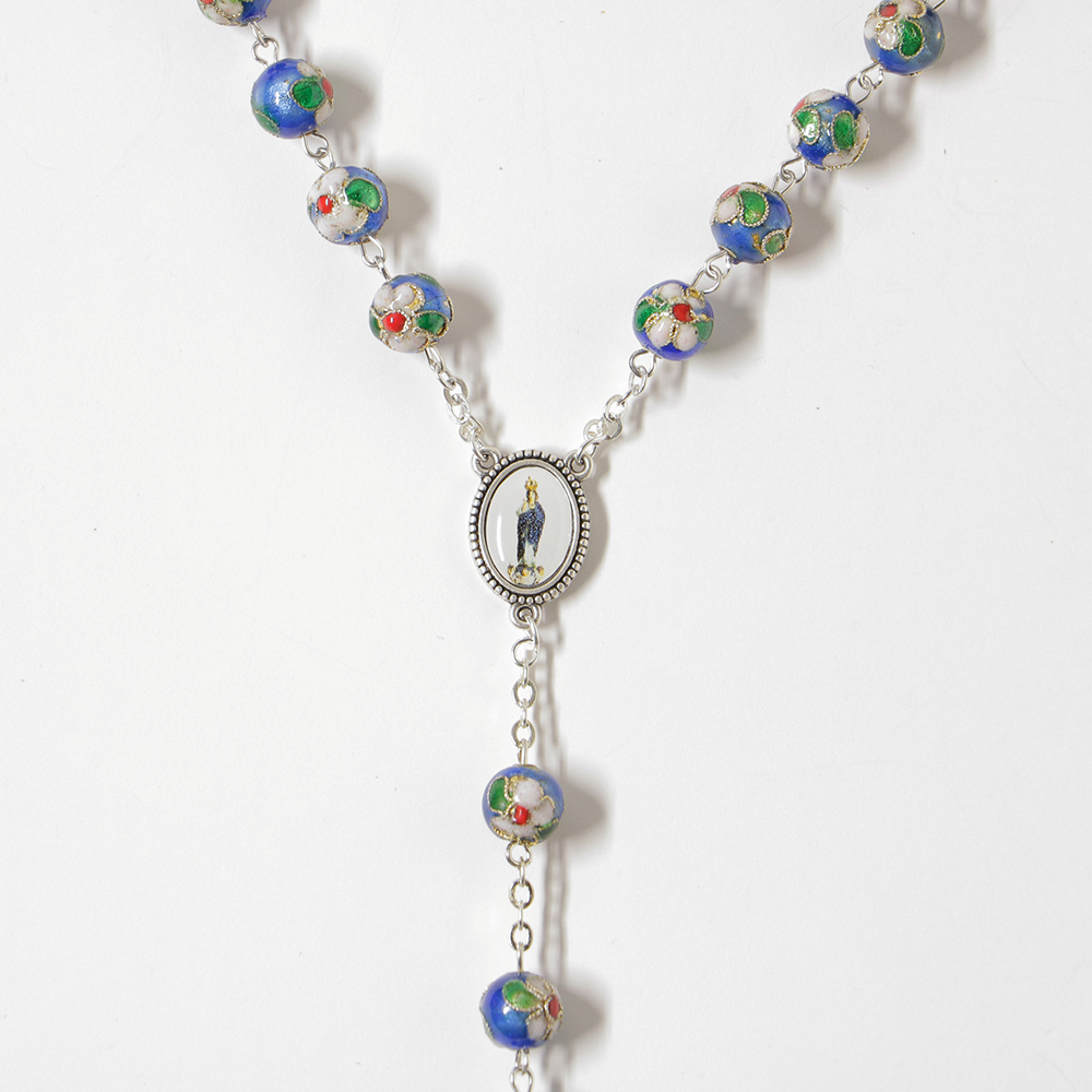 Este terço em pedra cloisonné 10mm, é muito bonito e original, tem cruz prateada e uma medalha da Nossa Senhora do Sameiro  no passador.