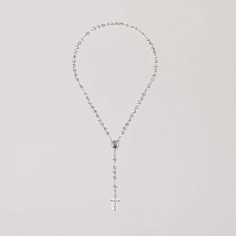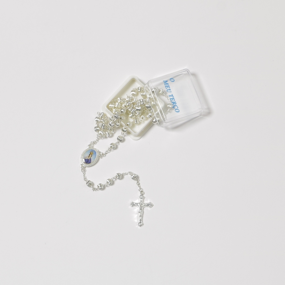 Terço em metal prateado, 43cm. Terço refinado e elegante, tem cruz prateada e imagem da Nossa Senhora do Sameiro no passador.