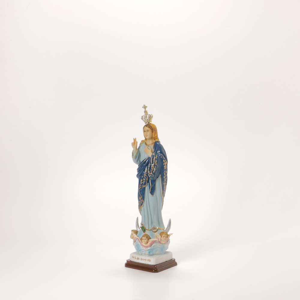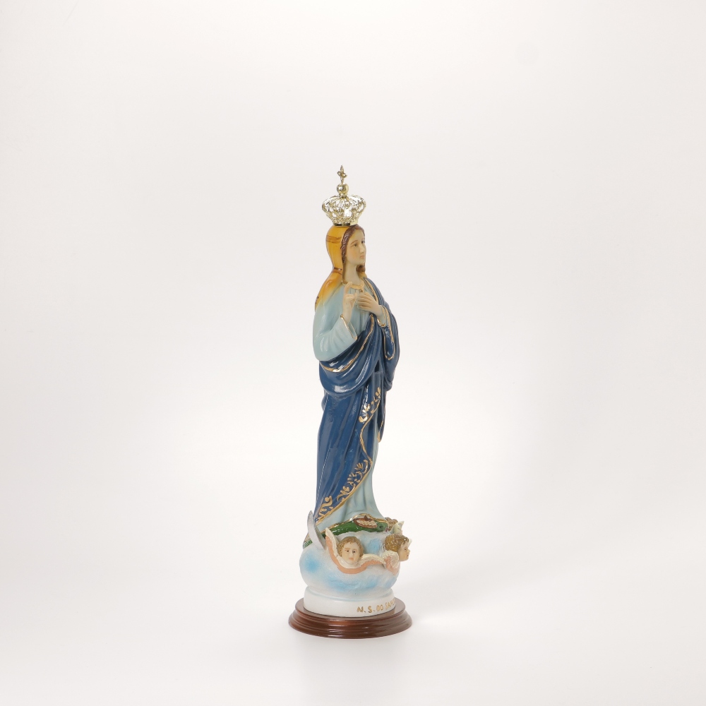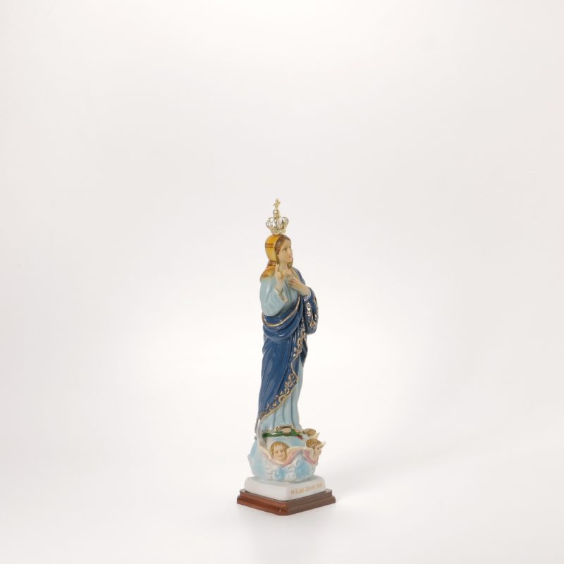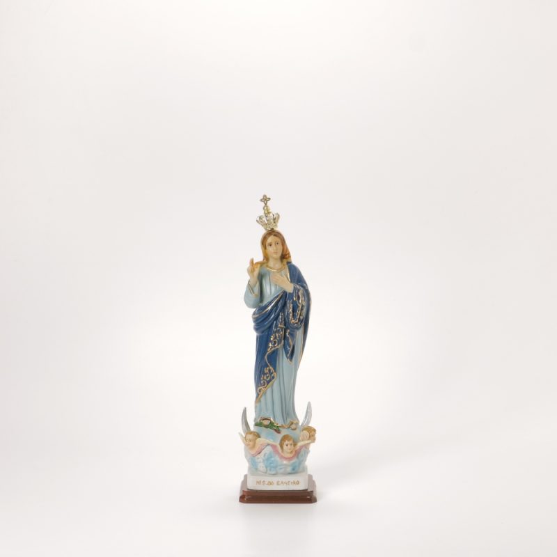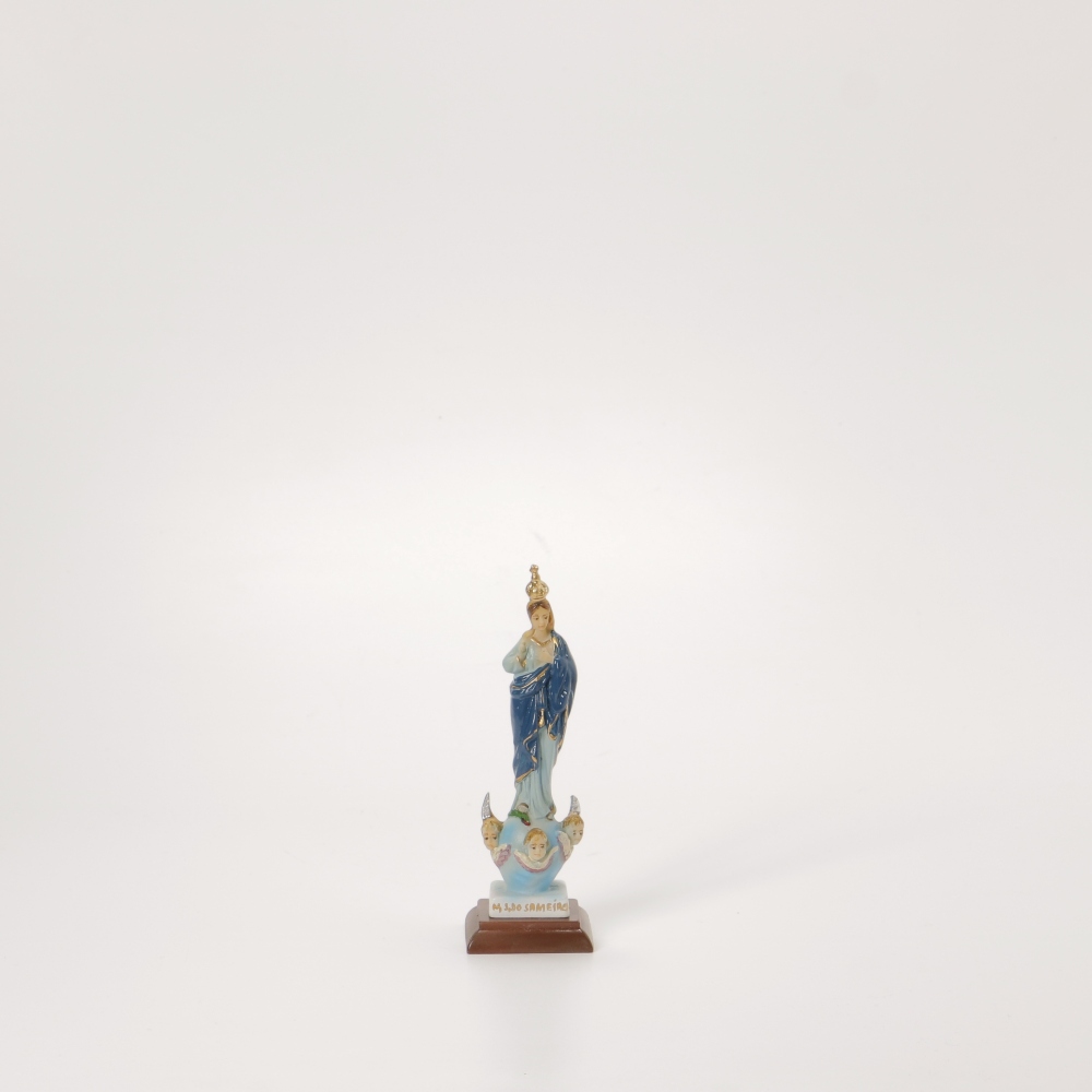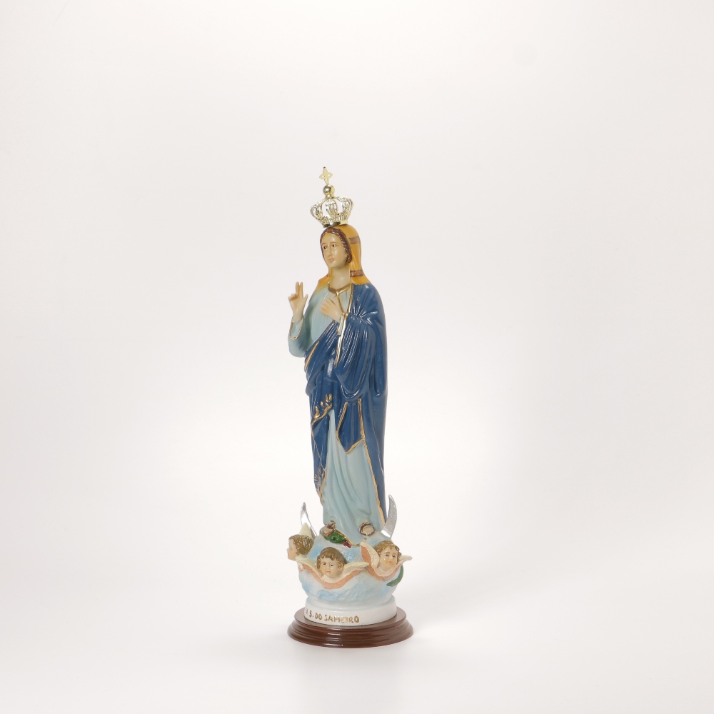 Imagem Nossa Senhora do Sameiro em marfinite pintada à mão, com base em madeira. Escultura muito elegante e de qualidade. A Nossa Senhora do Sameiro apresenta-se bela, rosto sereno e luminoso, vestes azuis e rodeada aos pés por três anjos que a elevam ao céu.