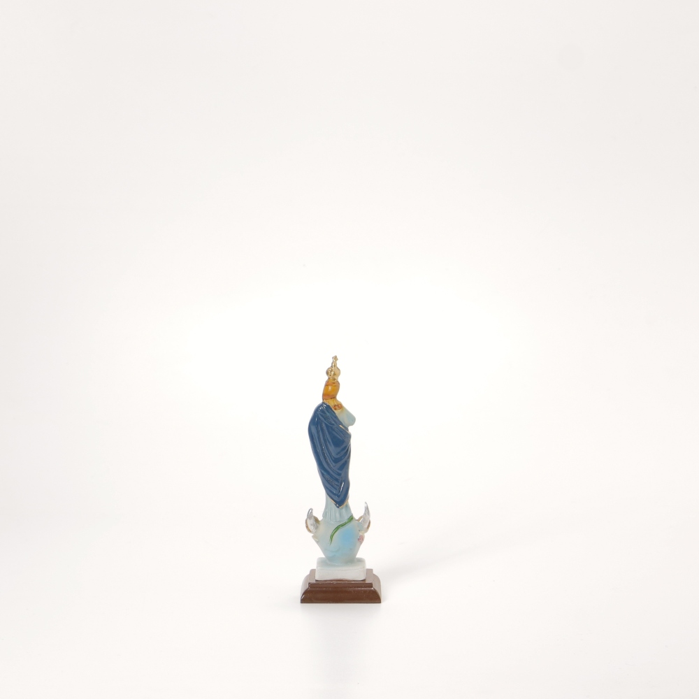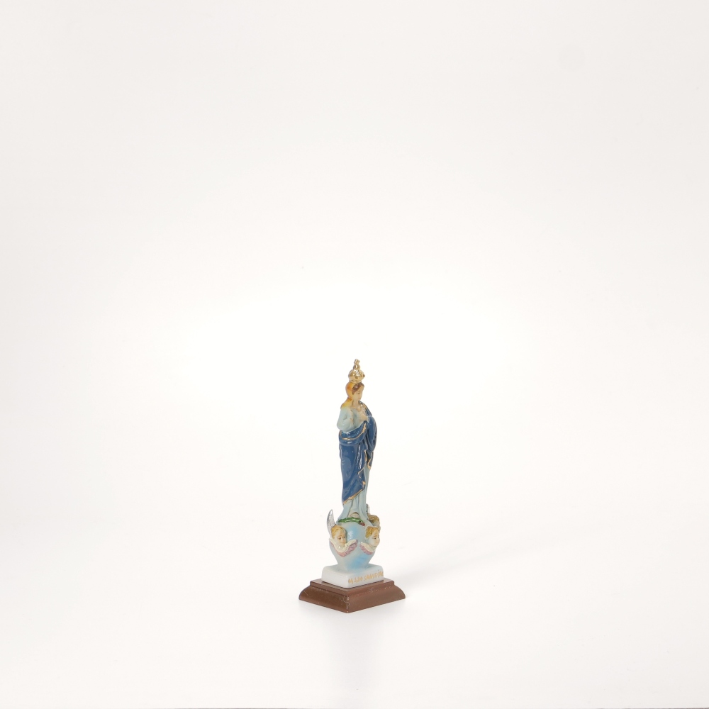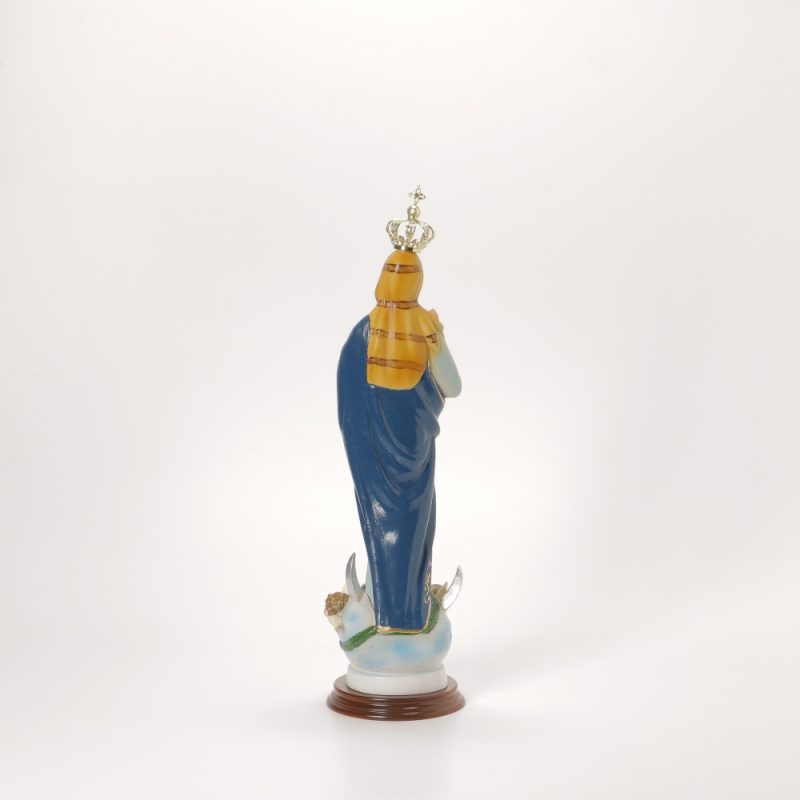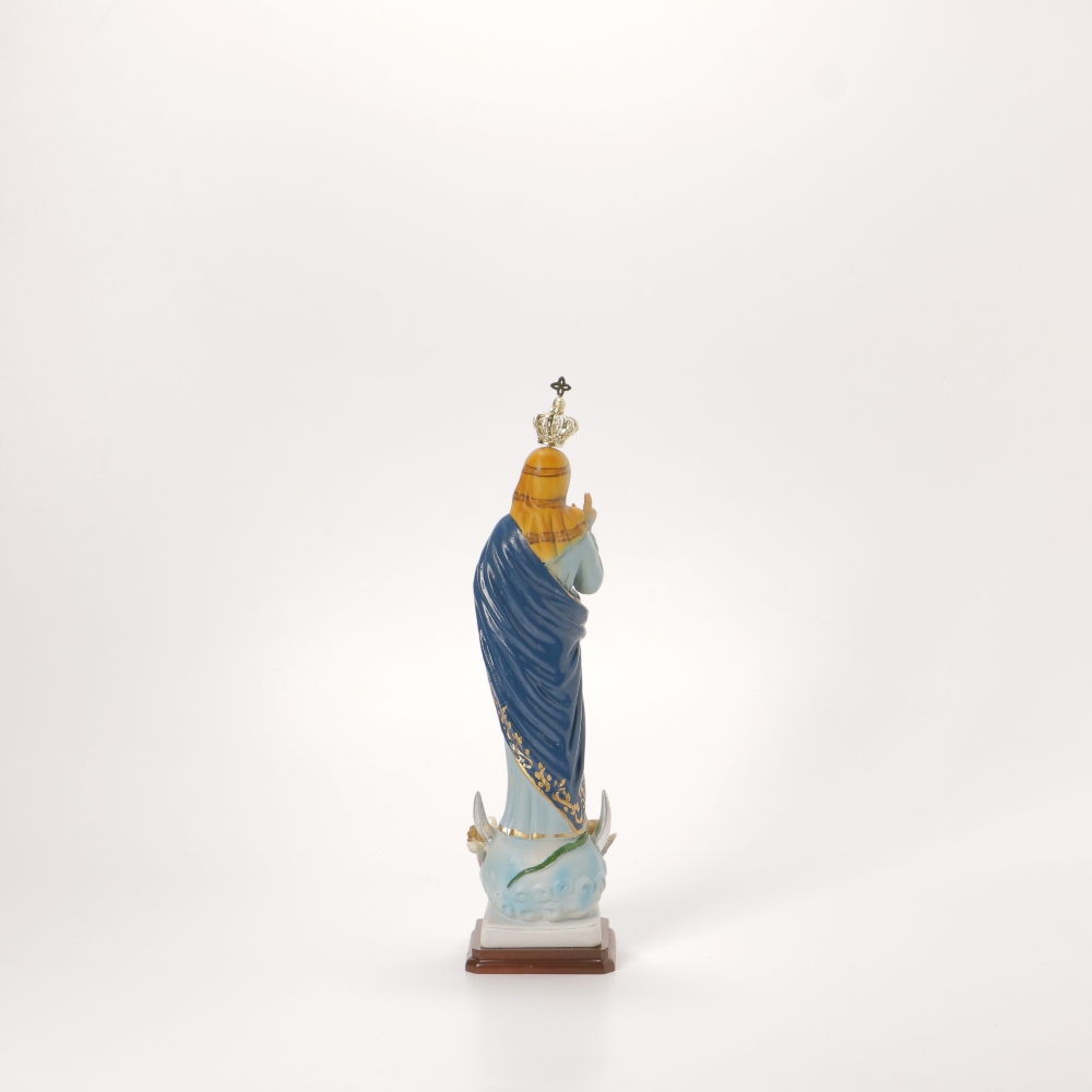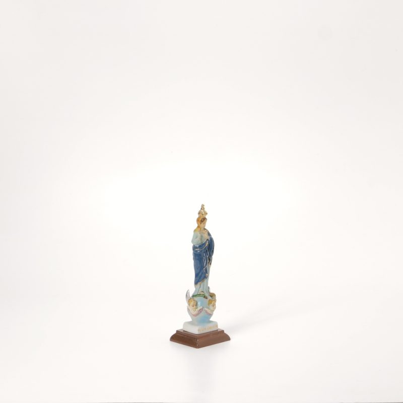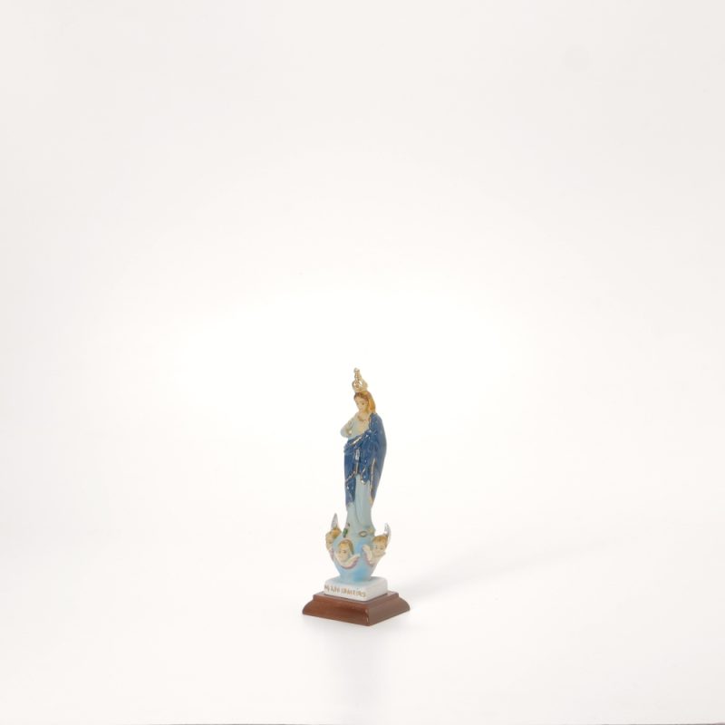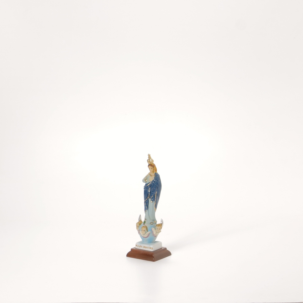 Imagem Nossa Senhora do Sameiro em marfinite pintada à mão, com base em madeira. Escultura muito elegante e de qualidade. A Nossa Senhora do Sameiro apresenta-se bela, rosto sereno e luminoso, vestes azuis e rodeada aos pés por três anjos que a elevam ao céu.