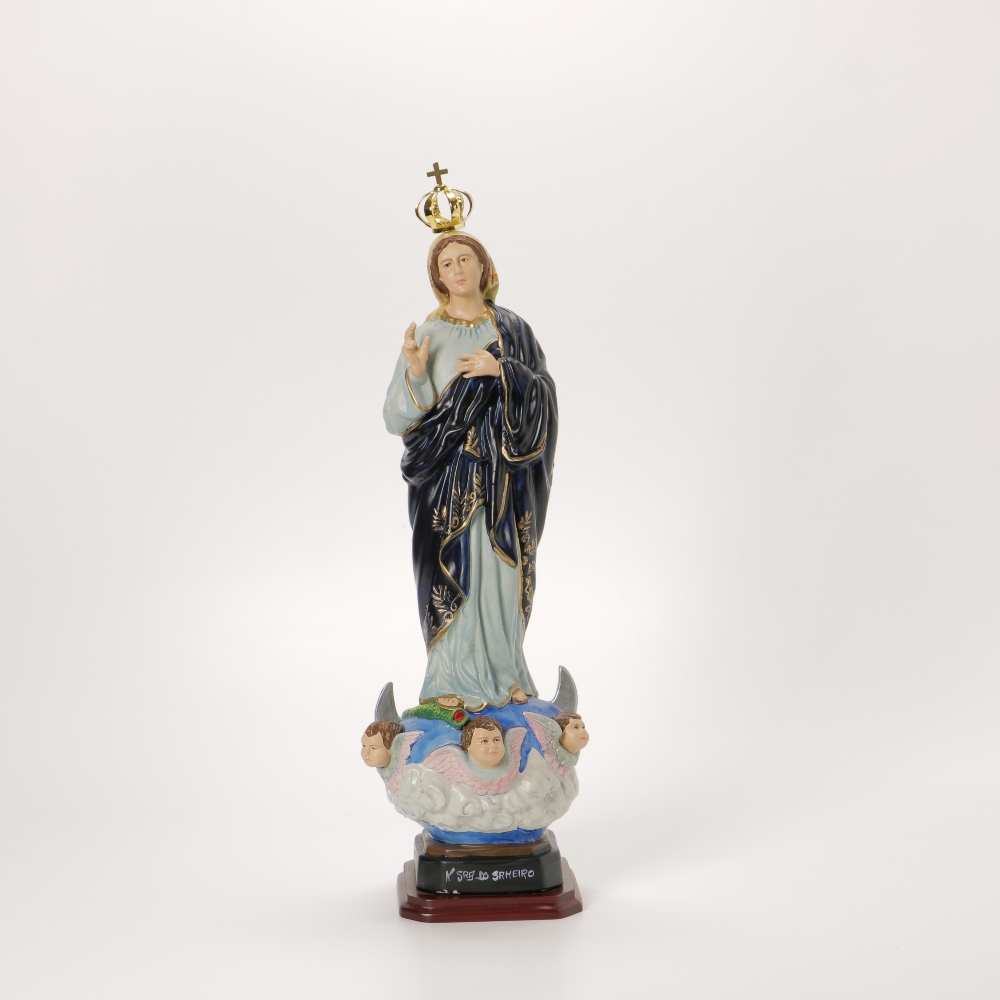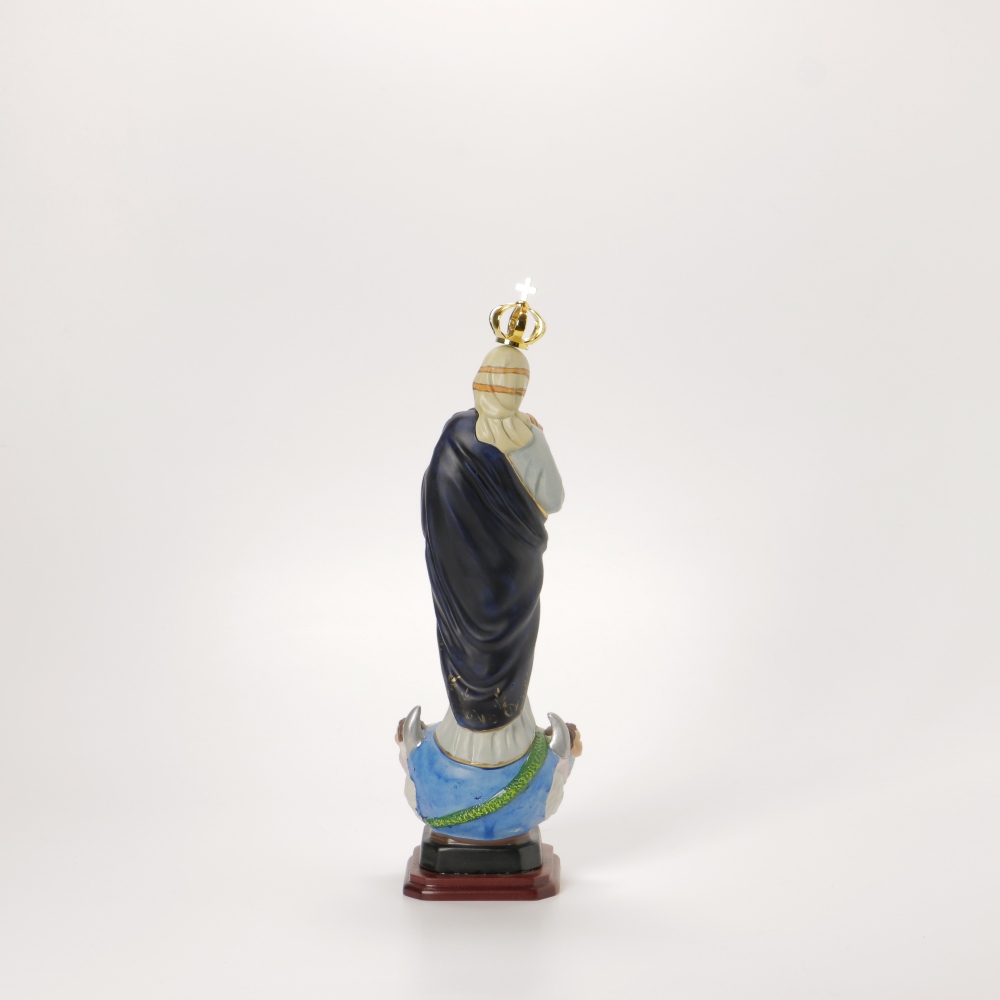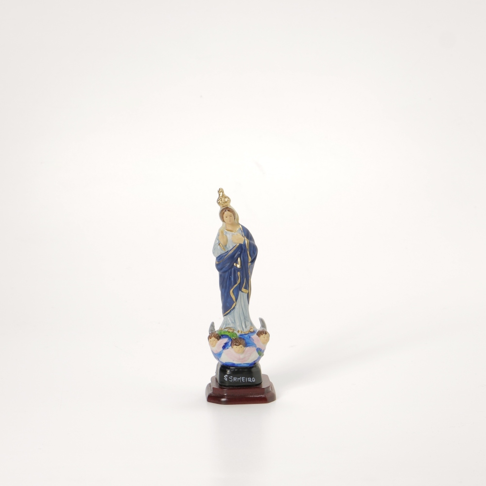 Imagem Nossa Senhora do Sameiro em porcelana pintada à mão, com base em madeira. Escultura muito elegante e de qualidade. A Nossa Senhora do Sameiro apresenta-se com enorme beleza de rosto sereno e luminoso, vestes azuis e rodeada aos pés por três anjos que a elevam ao céu.