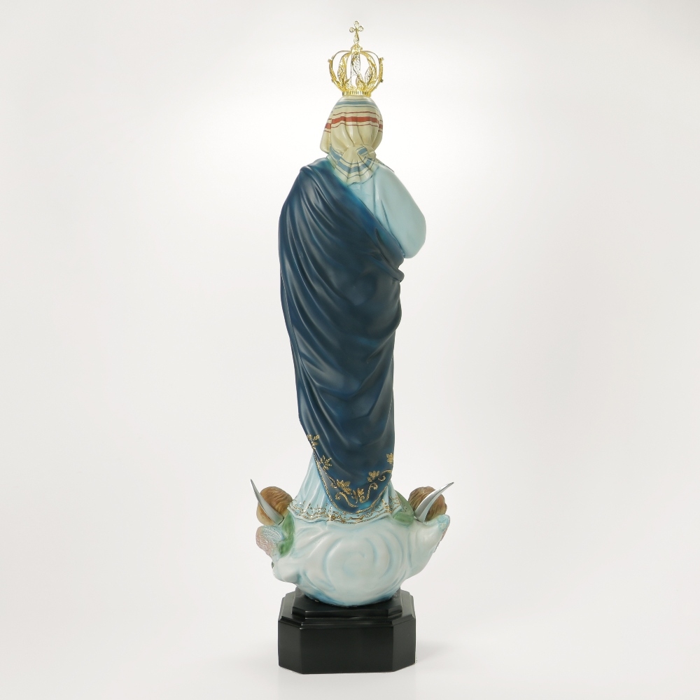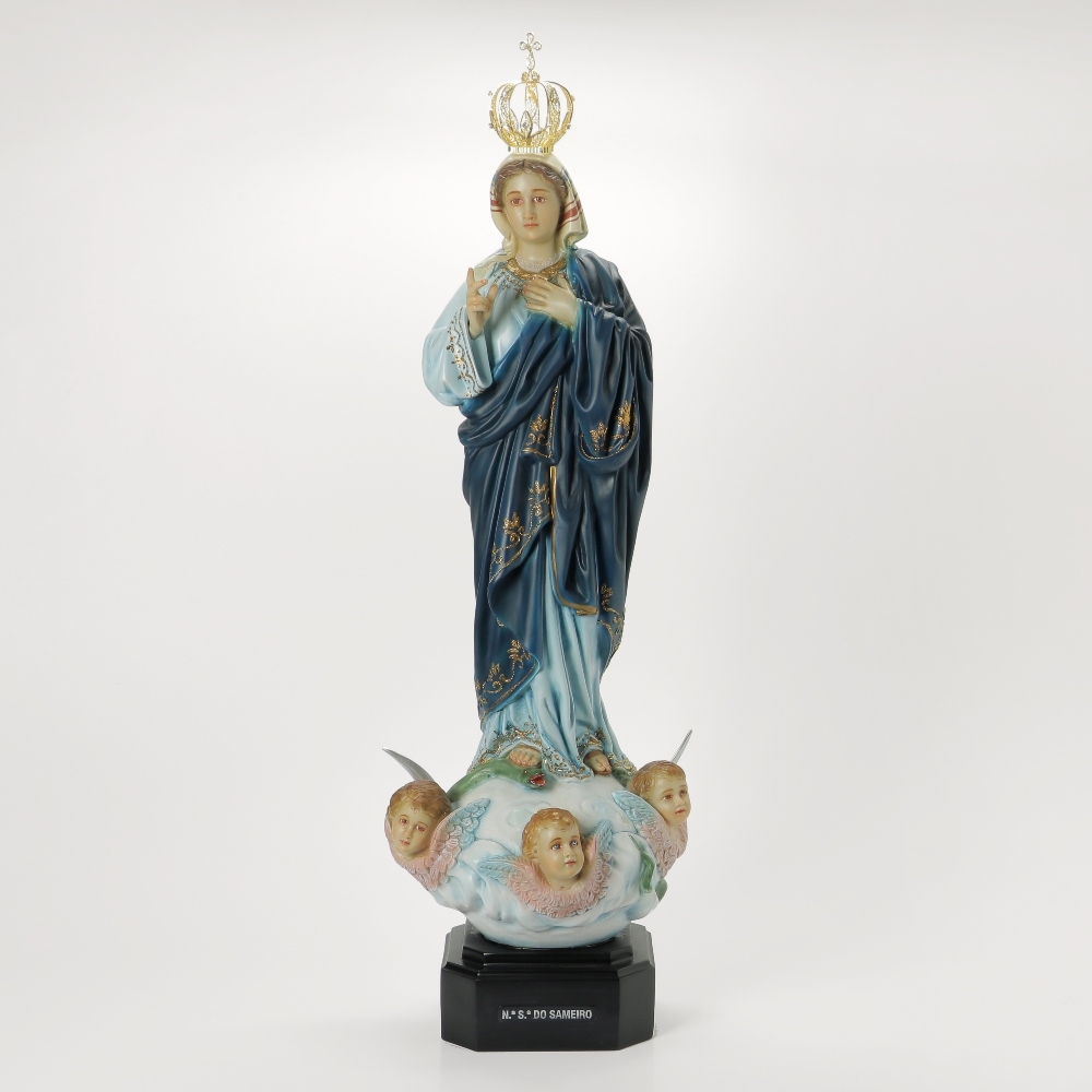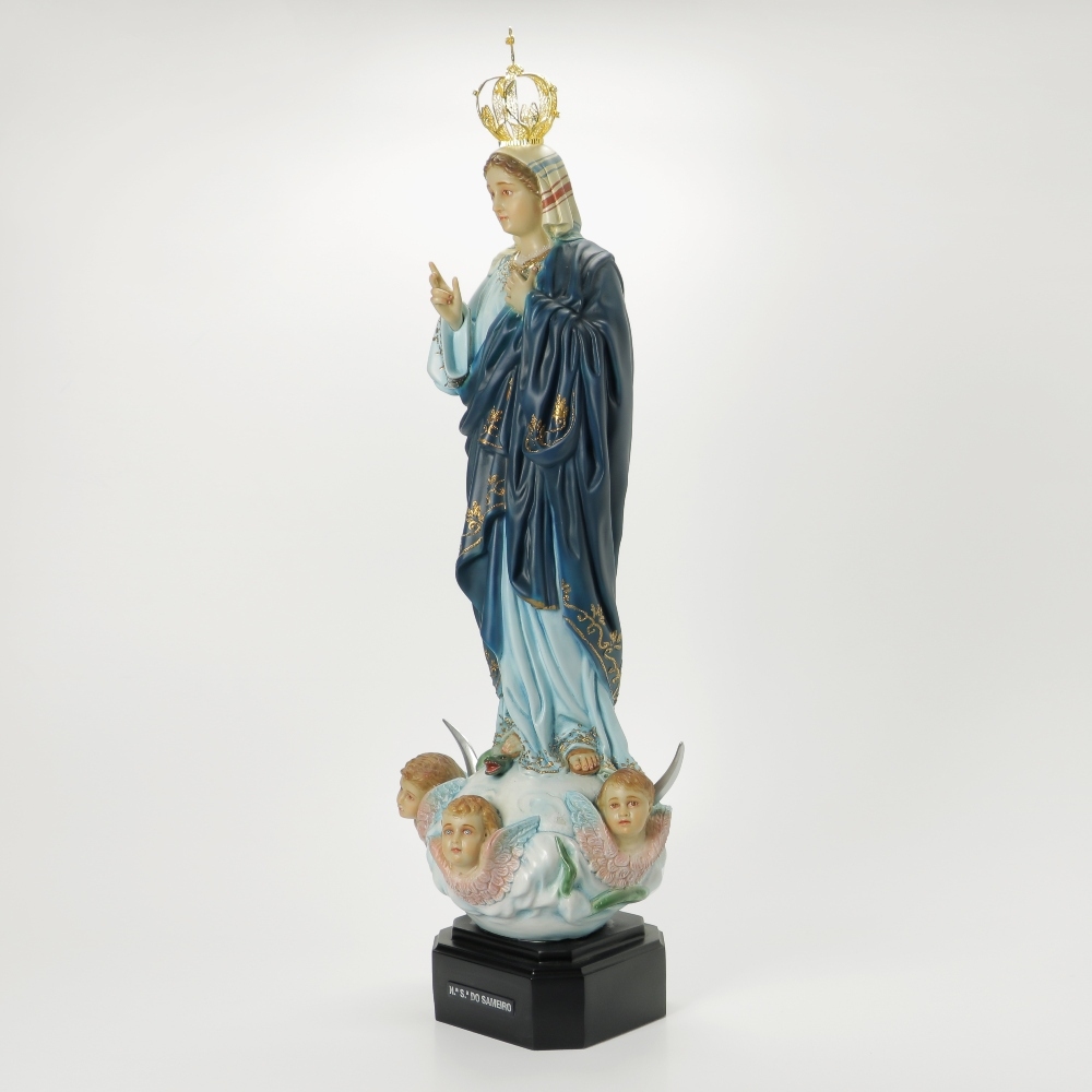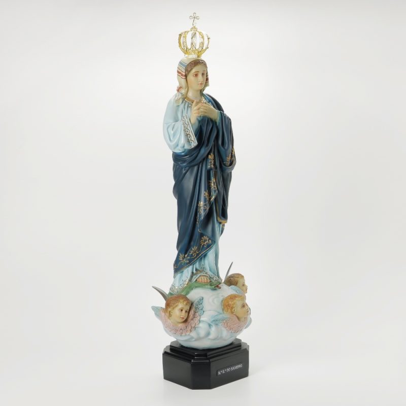 Imagem de qualidade e elegância, acabamentos e pormenores diferenciados, pintura de arte sacra no vestido, no rosto, e nas mãos da Nossa Senhora. Destaca-se ainda nesta imagem uma coroa em fio de filigrana dourada.