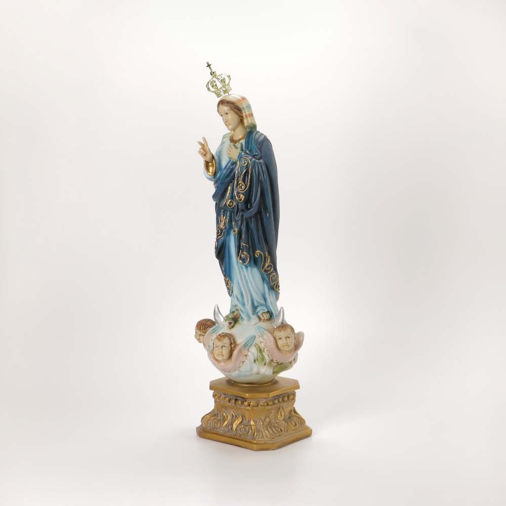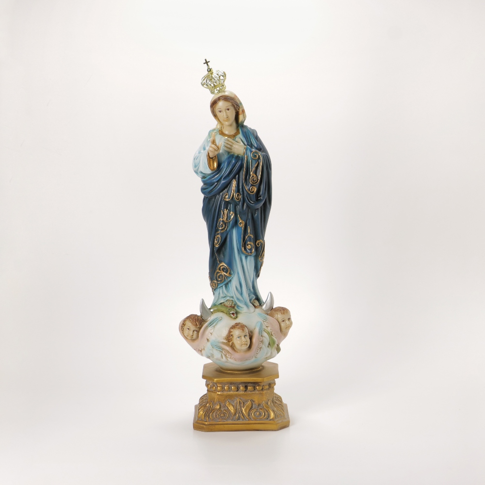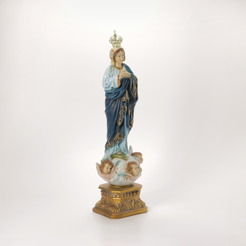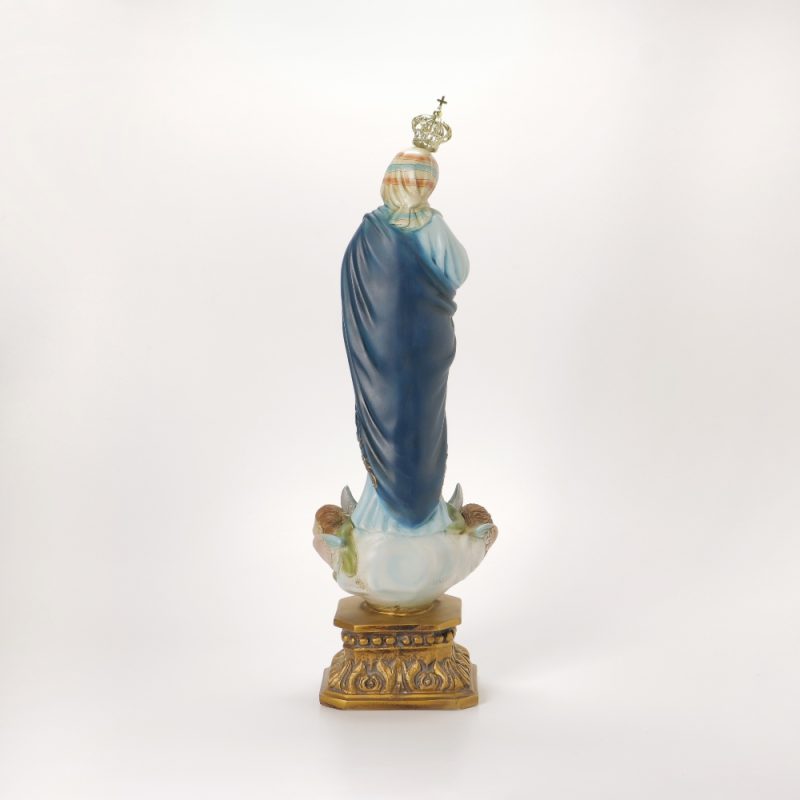 Imagem fina e elegante. A Nossa Senhora do Sameiro apresenta-se de vestes azuís, rodeada por 3 anjos que a elevam ao céu.