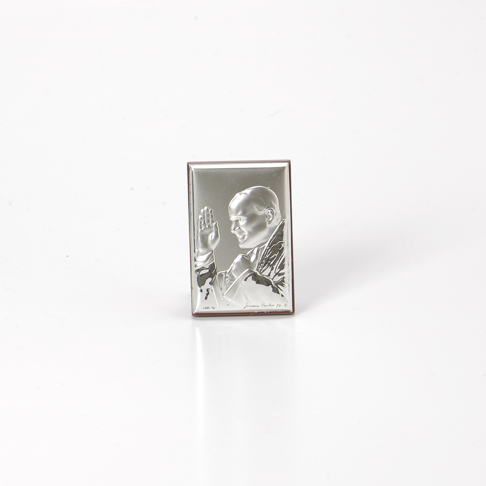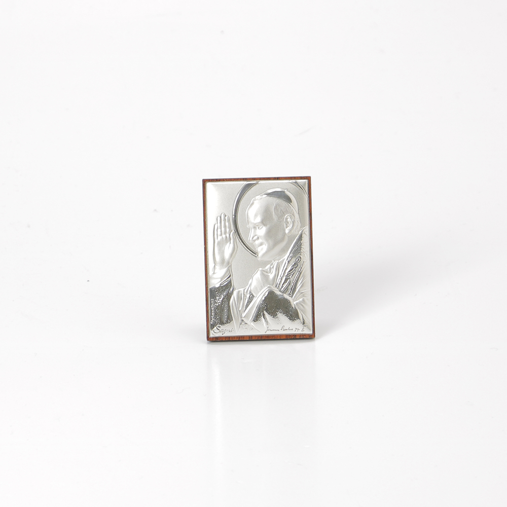 Moldura em prata revestida em madeira com o Santo Papa João Paulo II uma das placas tem um aro com o tamanho de 6x4cm.