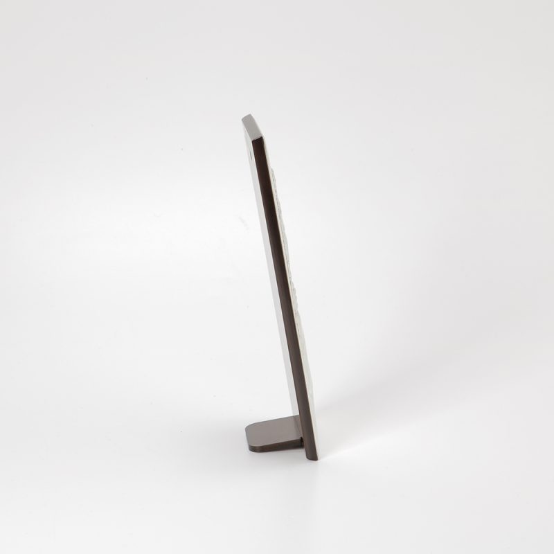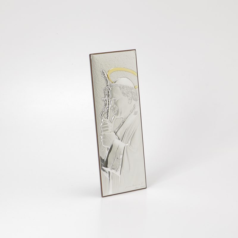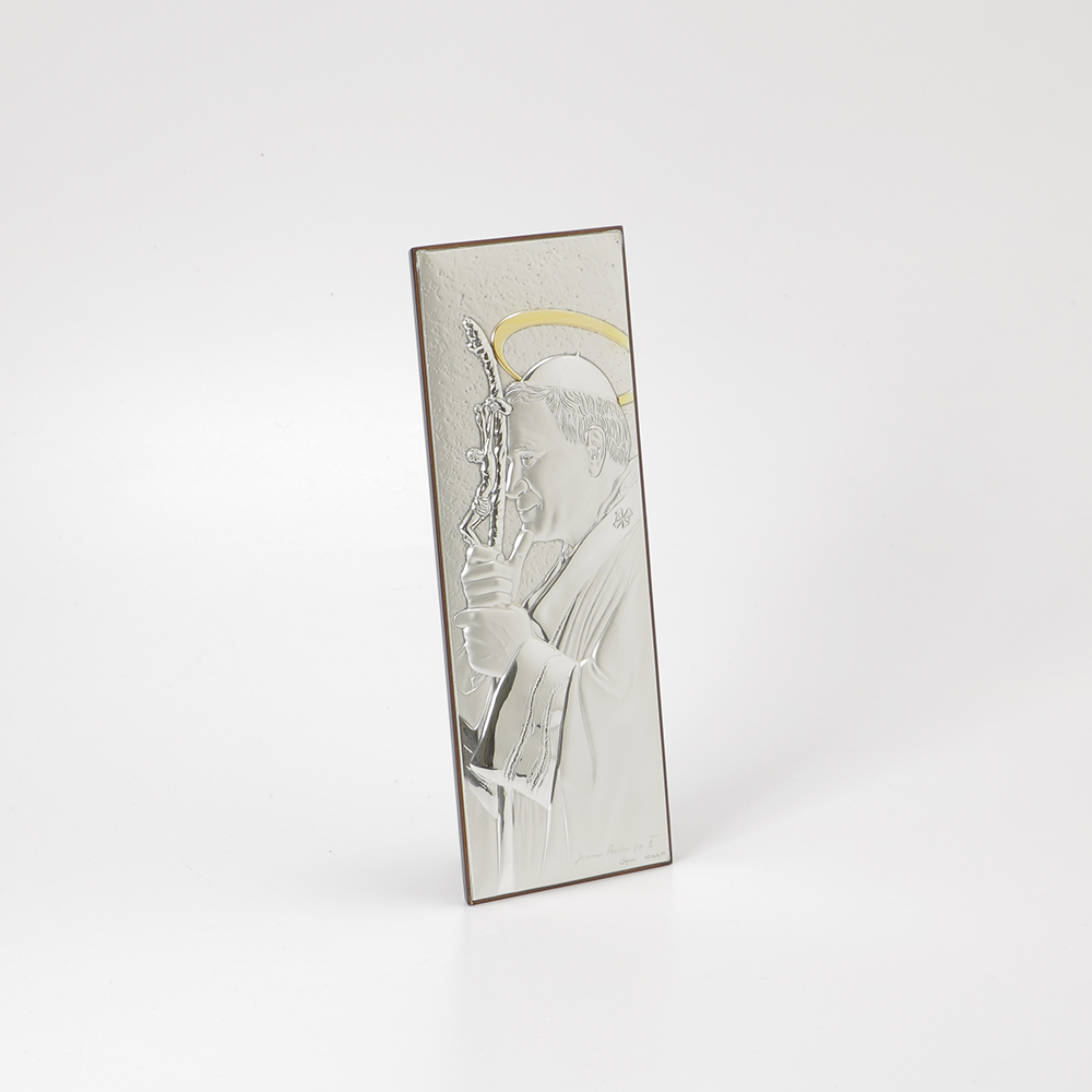 Placa em prata com o Santo Papa João Paulo II, com uns apontamentos em prata dourada com o tamanho de 6x16cm.
