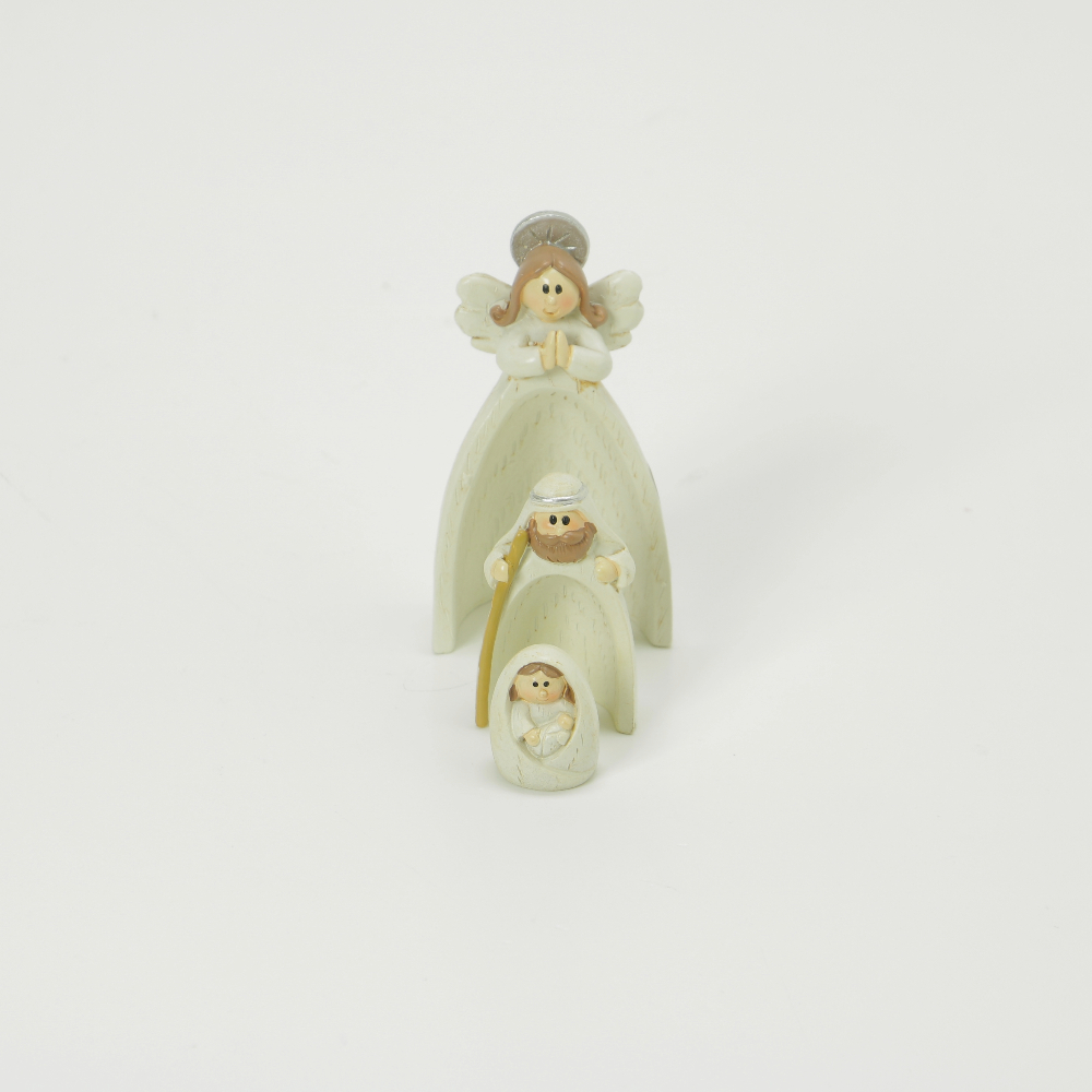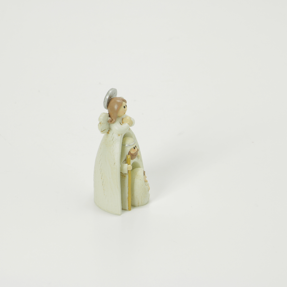 Presépio infantil com o tamanho 8,5x5cm em resina composto por a Sagrada Família e anjo em 3 peças que se unem.