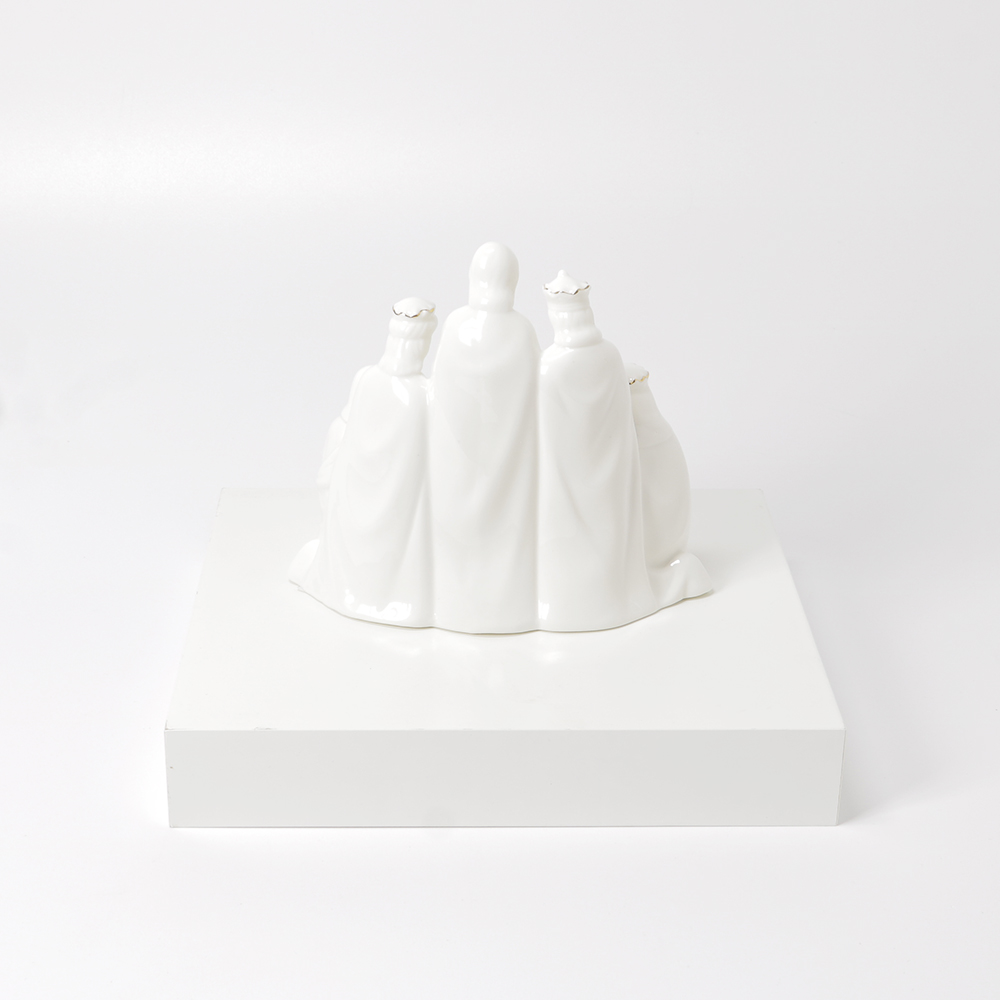 Sagrada família em loiça, com reis magos, esta peça contém luz.