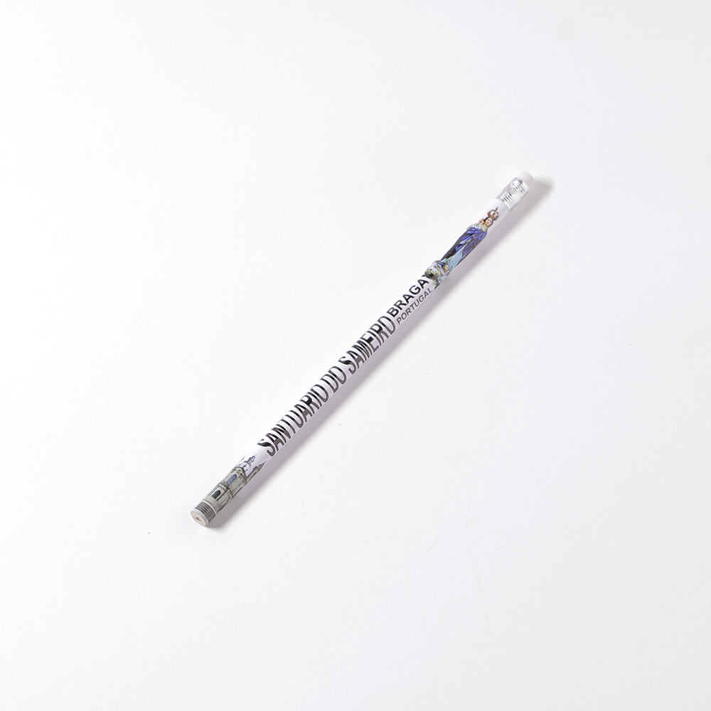 Lápis com Nossa Senhora do Sameiro, em madeira de cor branca.