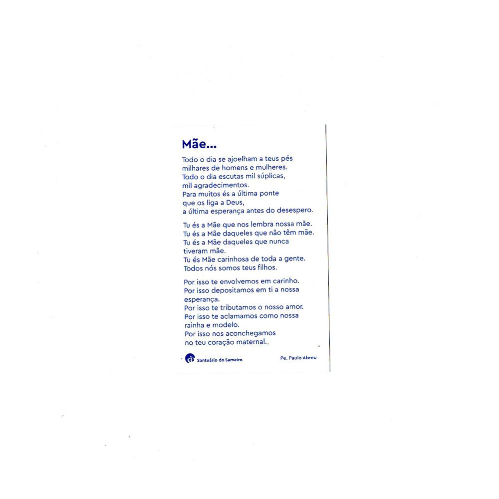 Pagela com a Nossa Senhora do Sameiro, e no verso um poema escrito por o Cónego José Paulo Abreu.