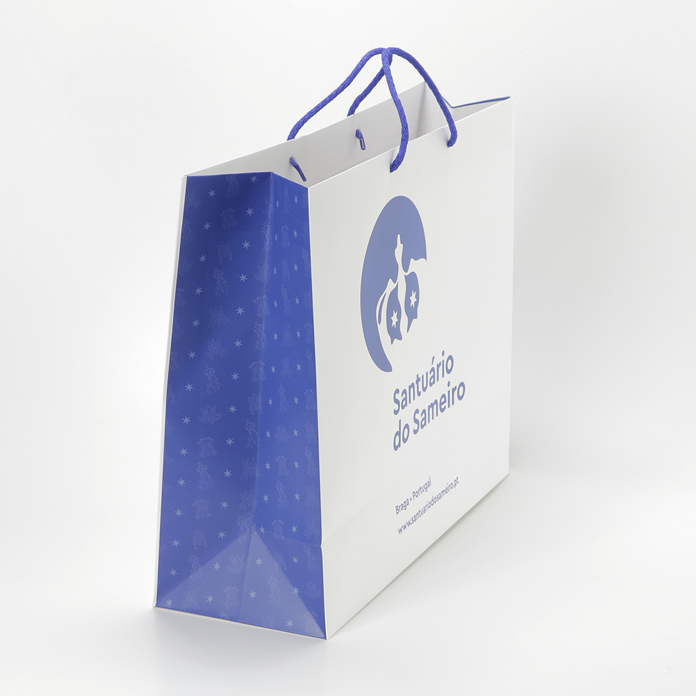 Saco de cartão grande com Símbolo da Coroa da Nossa Senhora do Sameiro, para embrulhar os seus presentes, com lateral azul com a coroa da Nossa Senhora do Sameiro com abas em cordão azul.