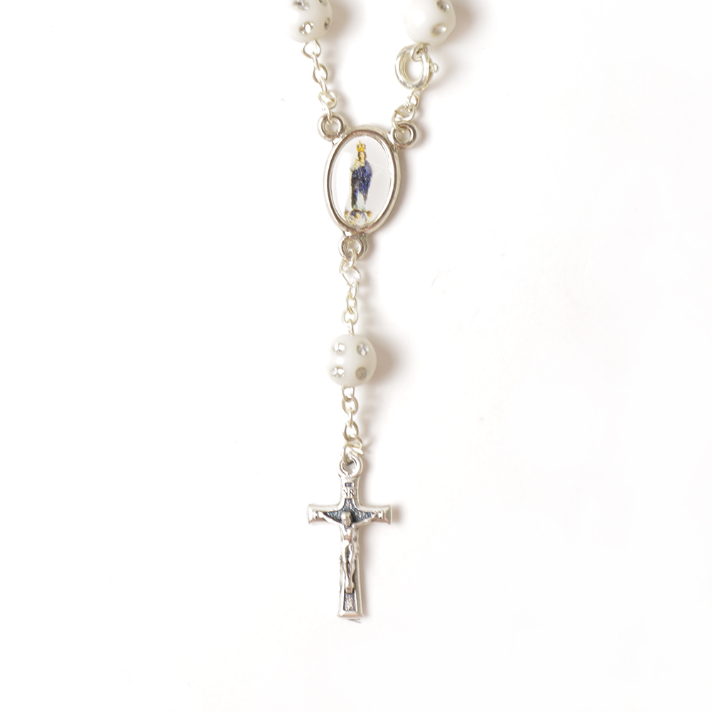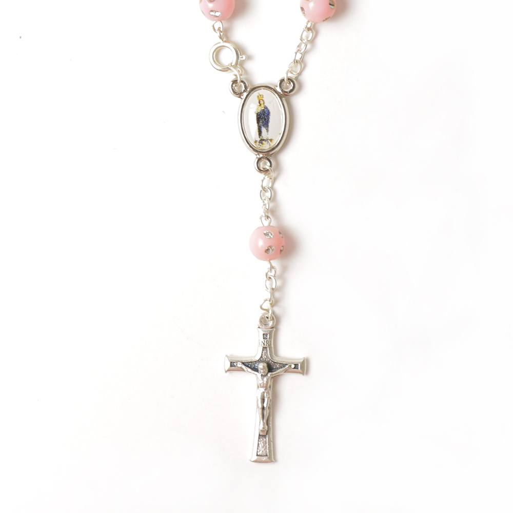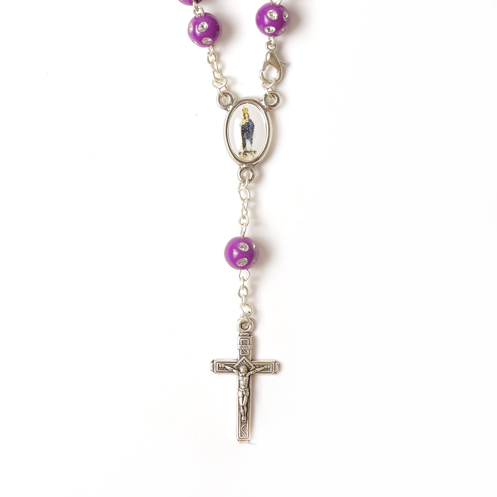 Dezena 14cm em plástico com fecho e uns detalhes com brilho, disponível em rosa claro, rosa forte, roxo, azul e branco, com medalha da Nossa Senhora do Sameiro.
