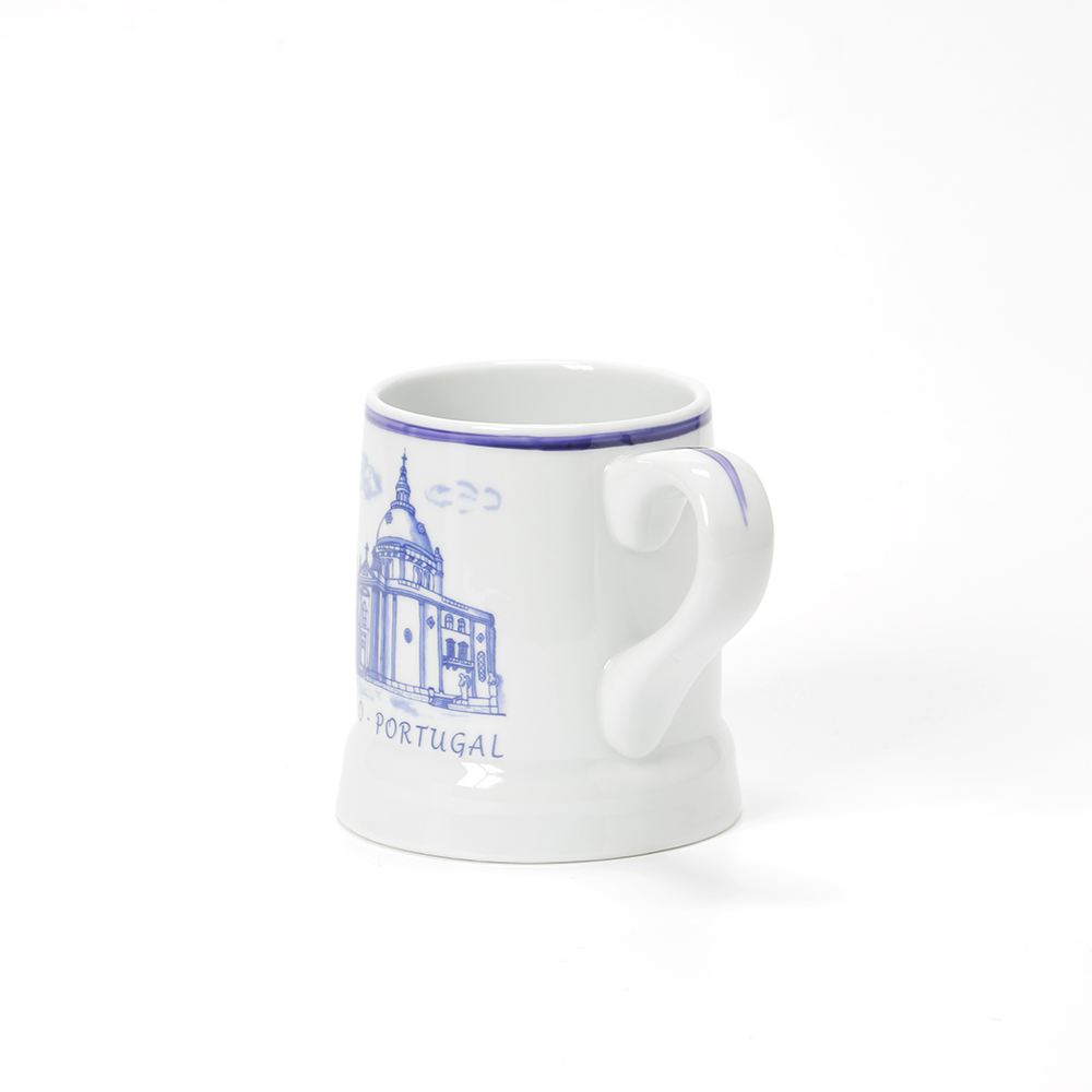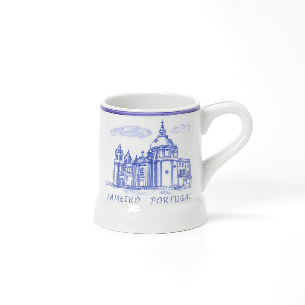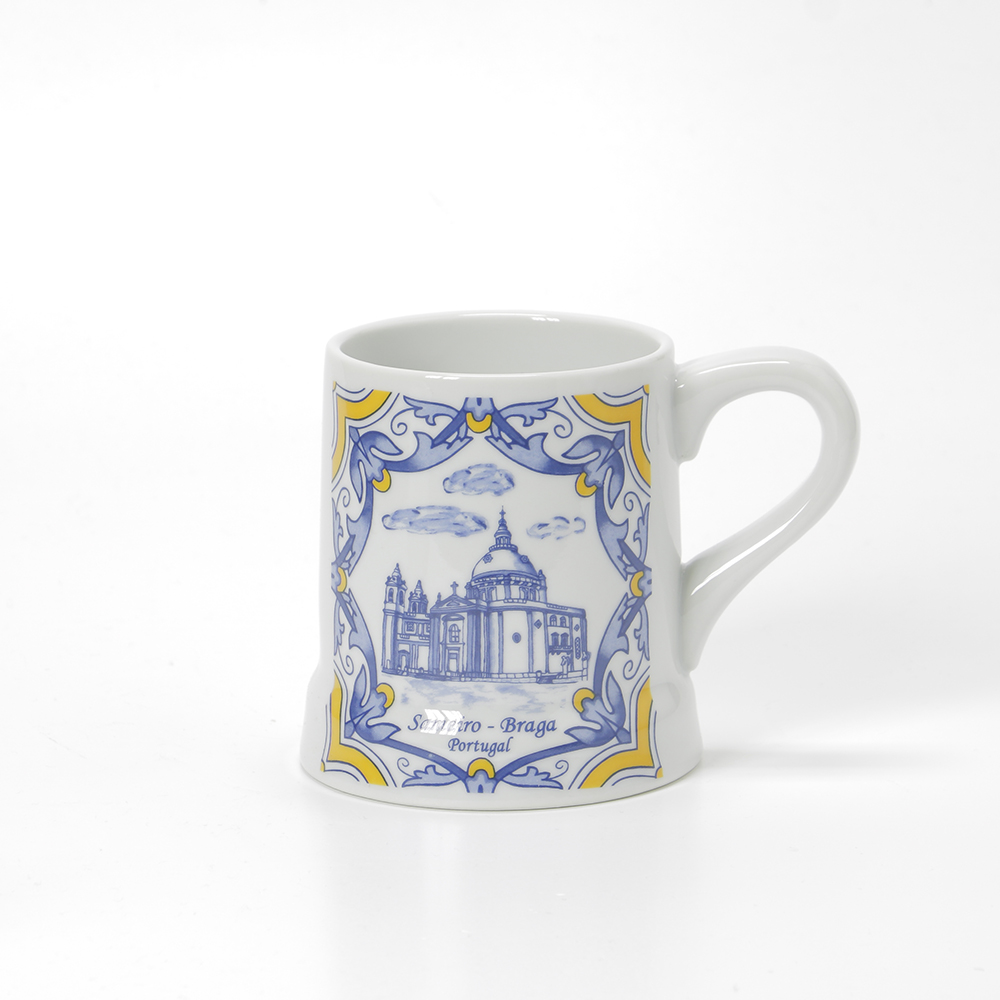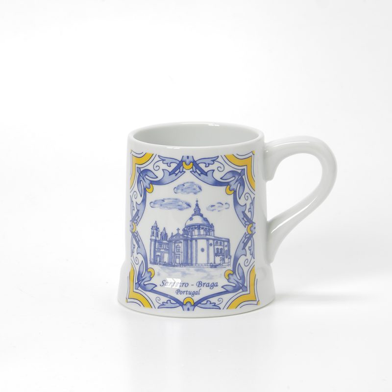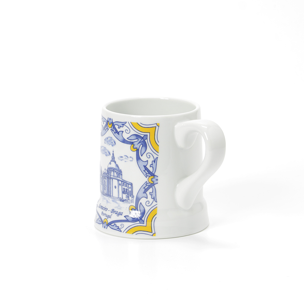 Caneca de 45cl com imagem do Santuário do Sameiro, as canecas têm pintura a imitar os tradicionais azulejo portugueses em tons de azul e branco e amarelo.