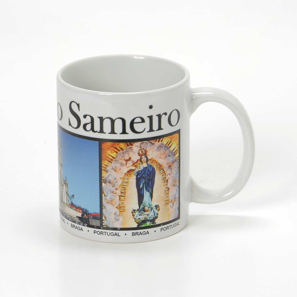 Caneca Santuário do Sameiro em cerâmica com imagens da Nossa Senhora do Sameiro e do Santuário do Sameiro da cor branca.