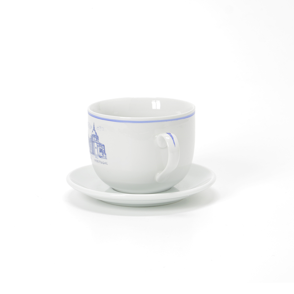 Chávena branca de pequeno almoço com pires, em porcelana 50cl, com desenho em azul da Basílica do Sameiro.