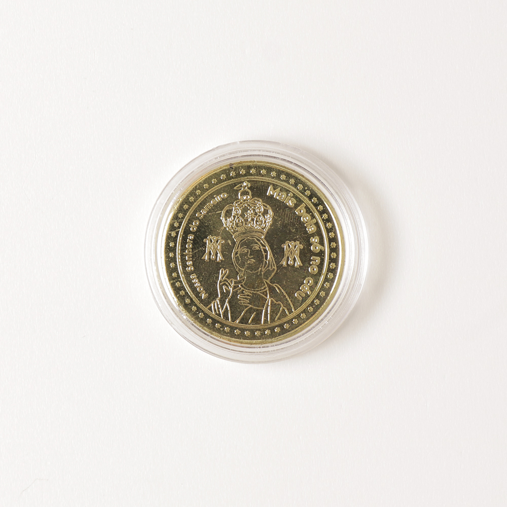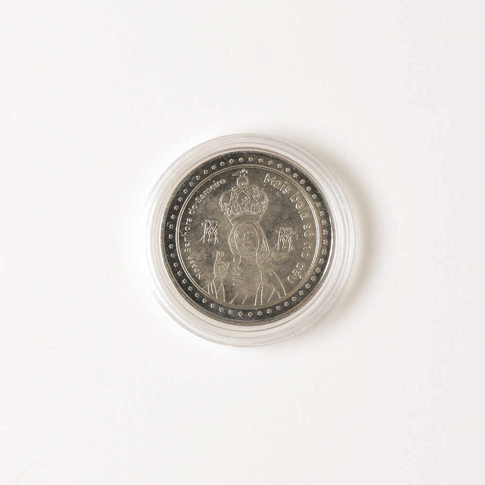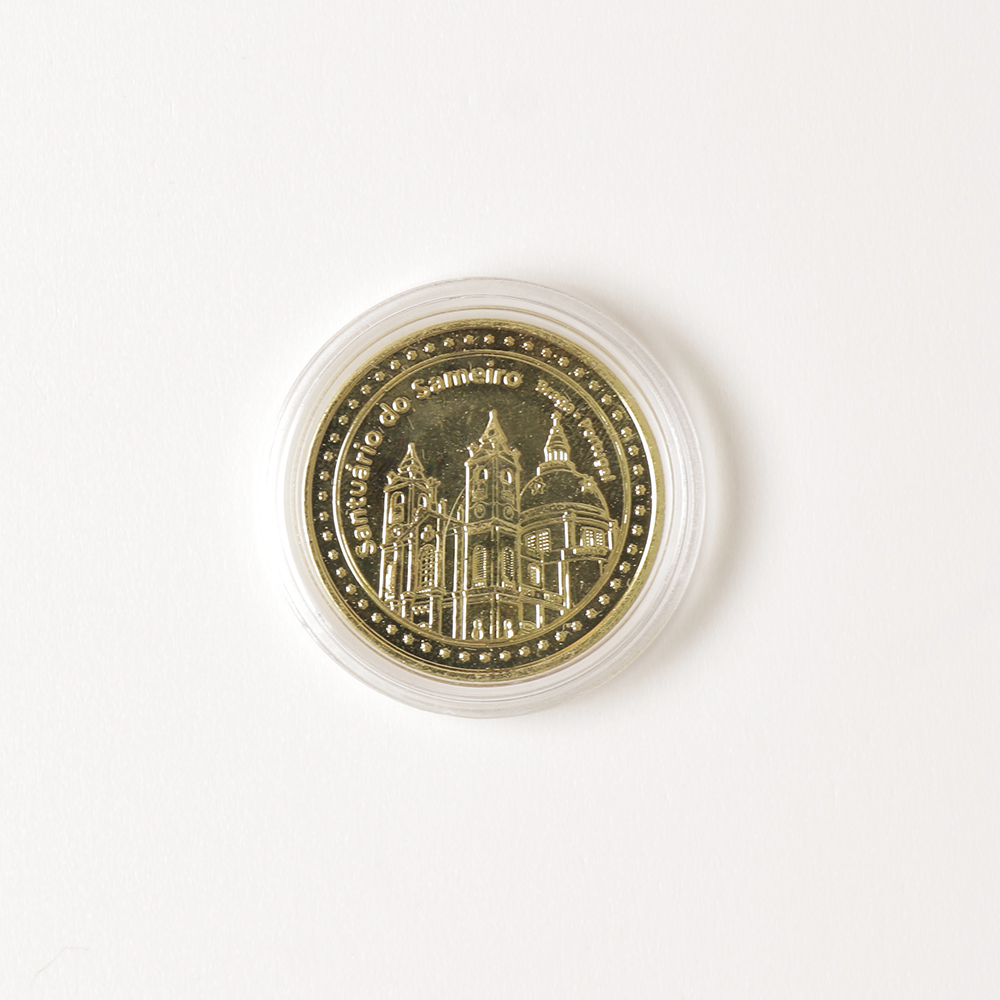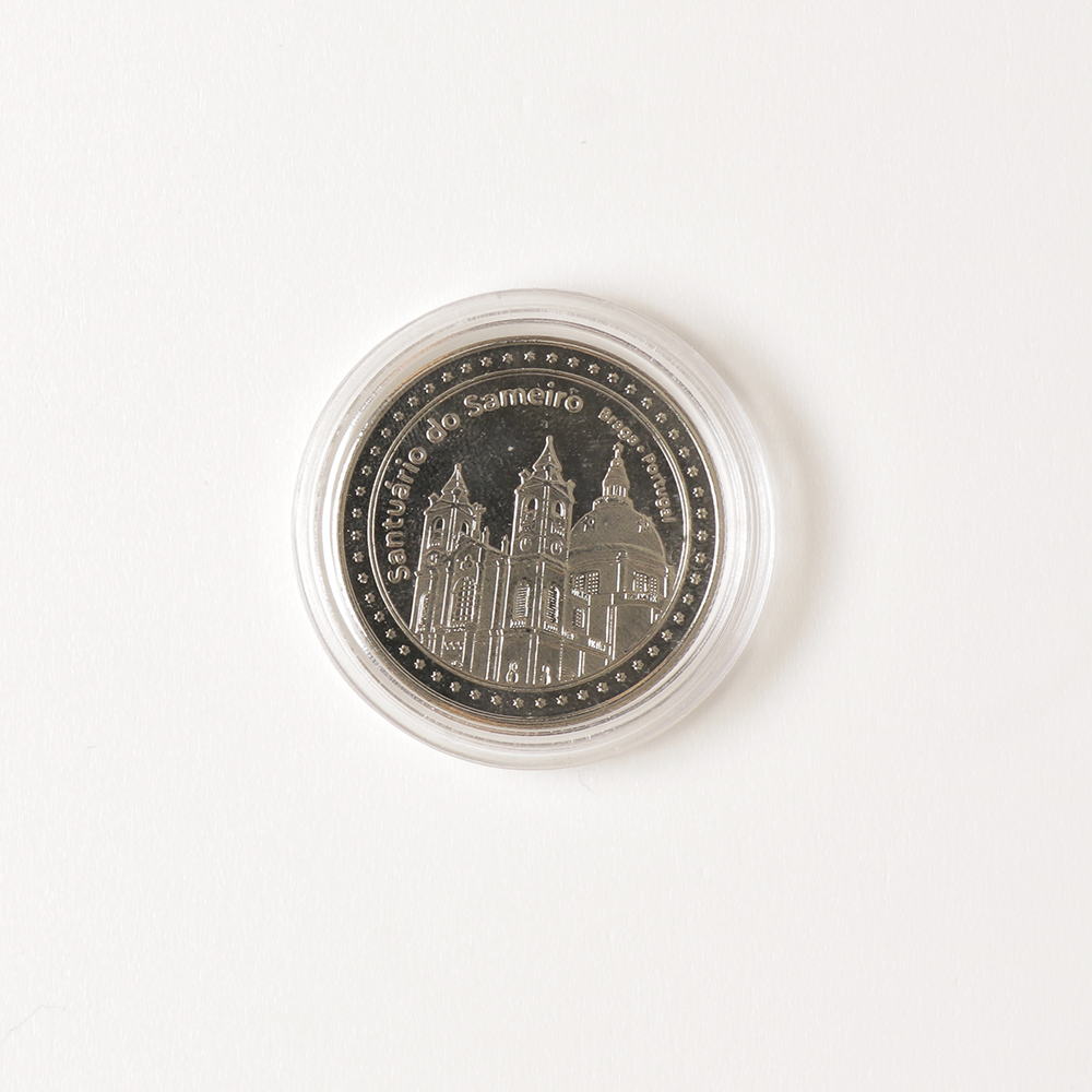 Moeda comemorativa com dupla face, de um lado a Nossa Senhora do Sameiro e do outro a Basílica do Santuário do Sameiro. Temos disponível em dourado e prateado.