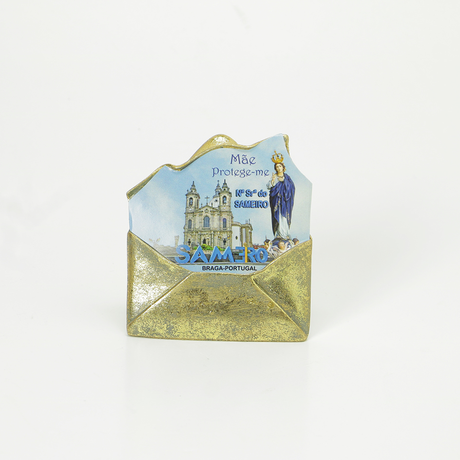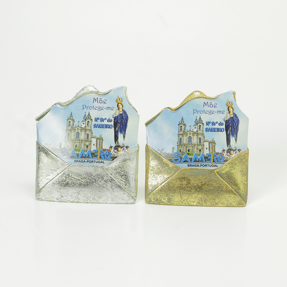 Envelope feito em resina, com Nossa Senhora do Sameiro, temos disponível em prateado e dourado.