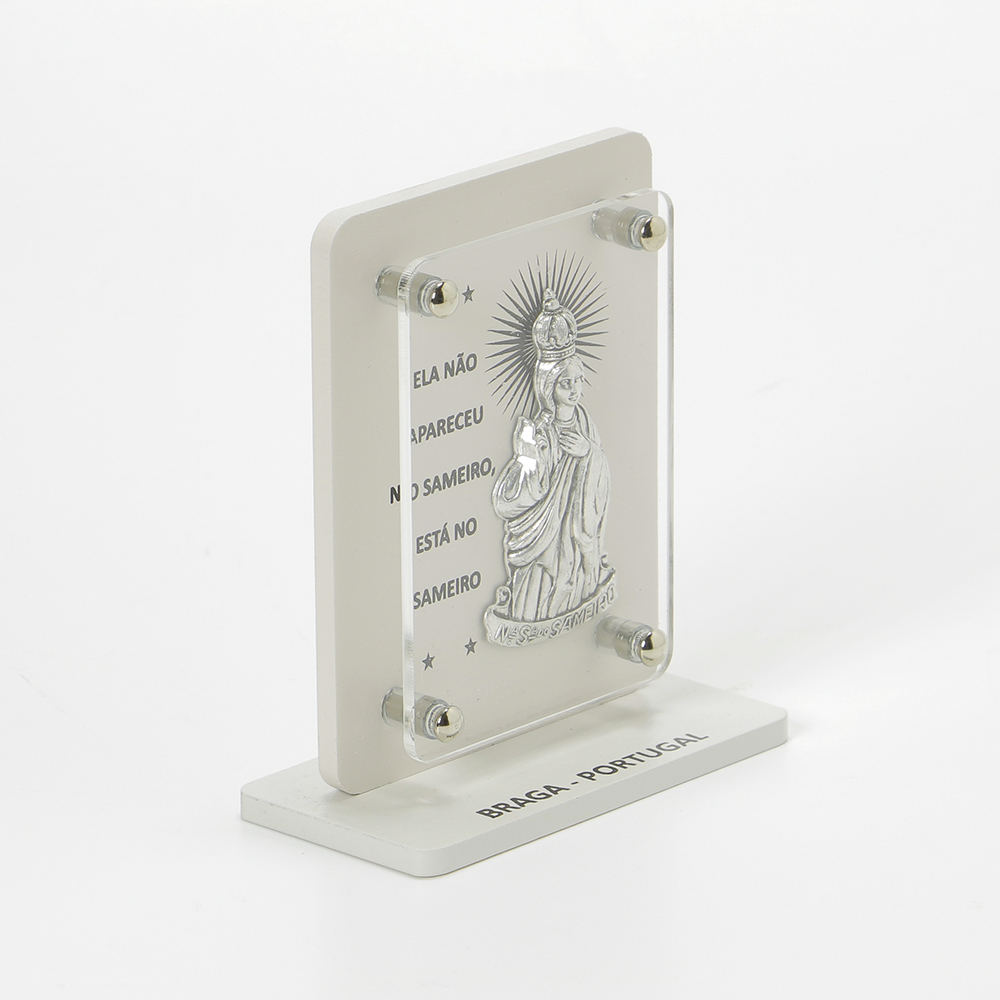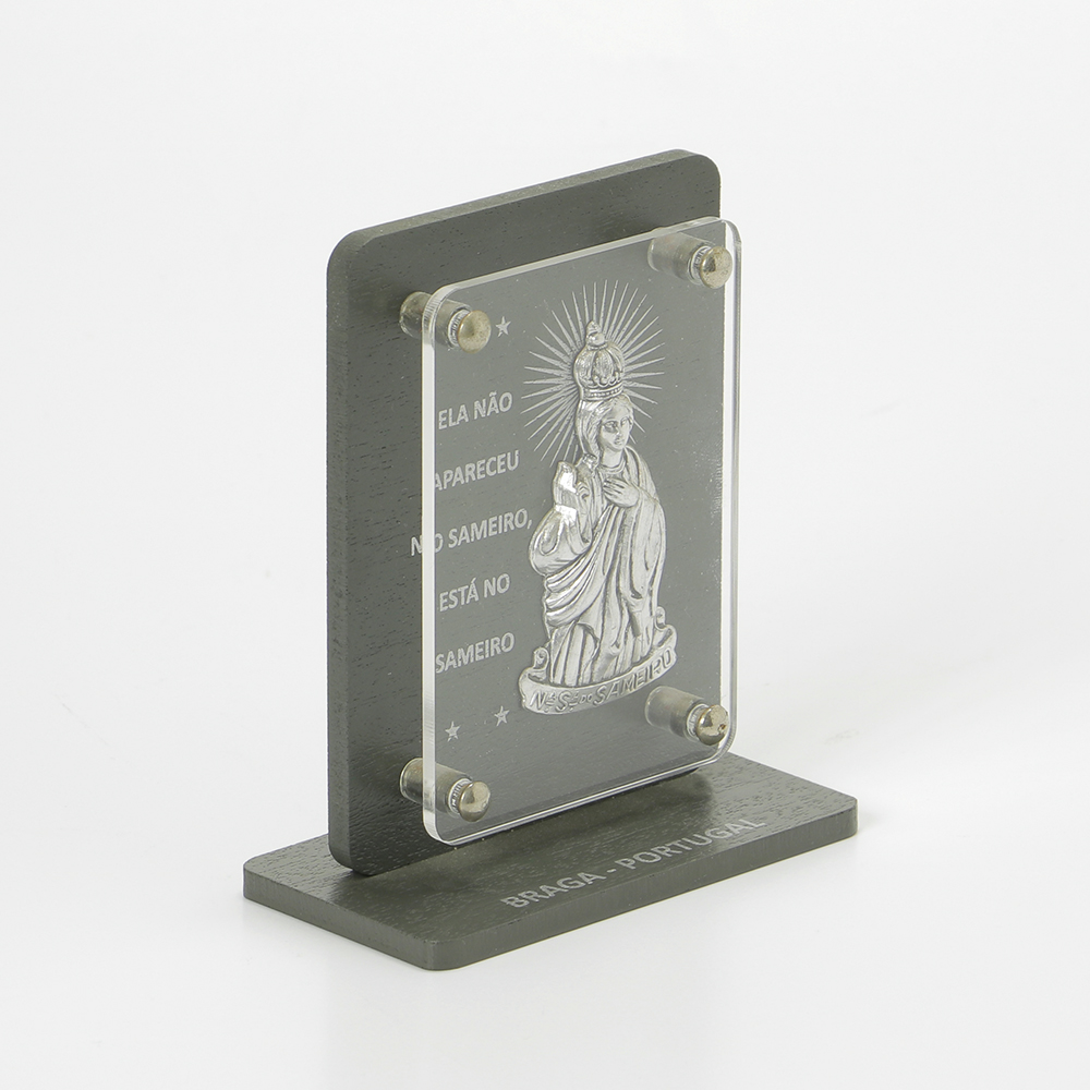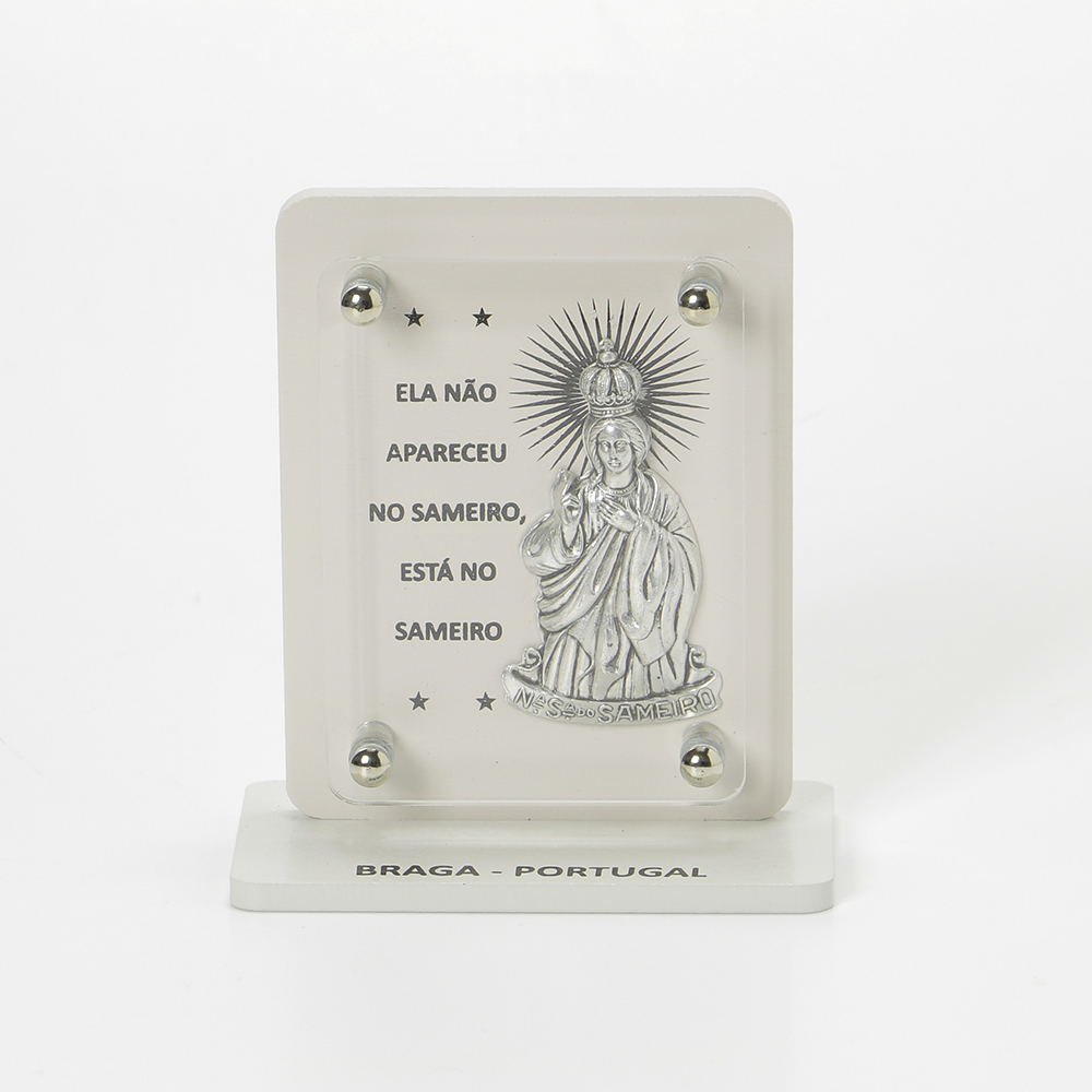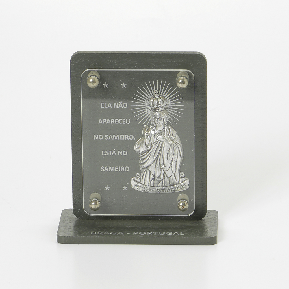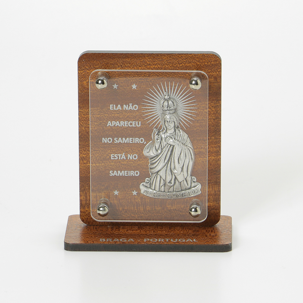 Placa com a imagem da Nossa Senhora do Sameiro, em madeira, frente em acrílico e pinos magnéticos, 11,5cm.