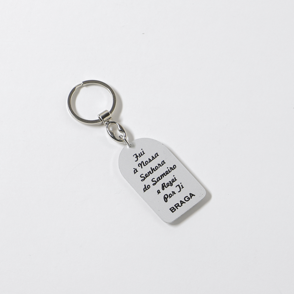 Porta-chaves prateado com imagem da Nossa Senhora do Sameiro