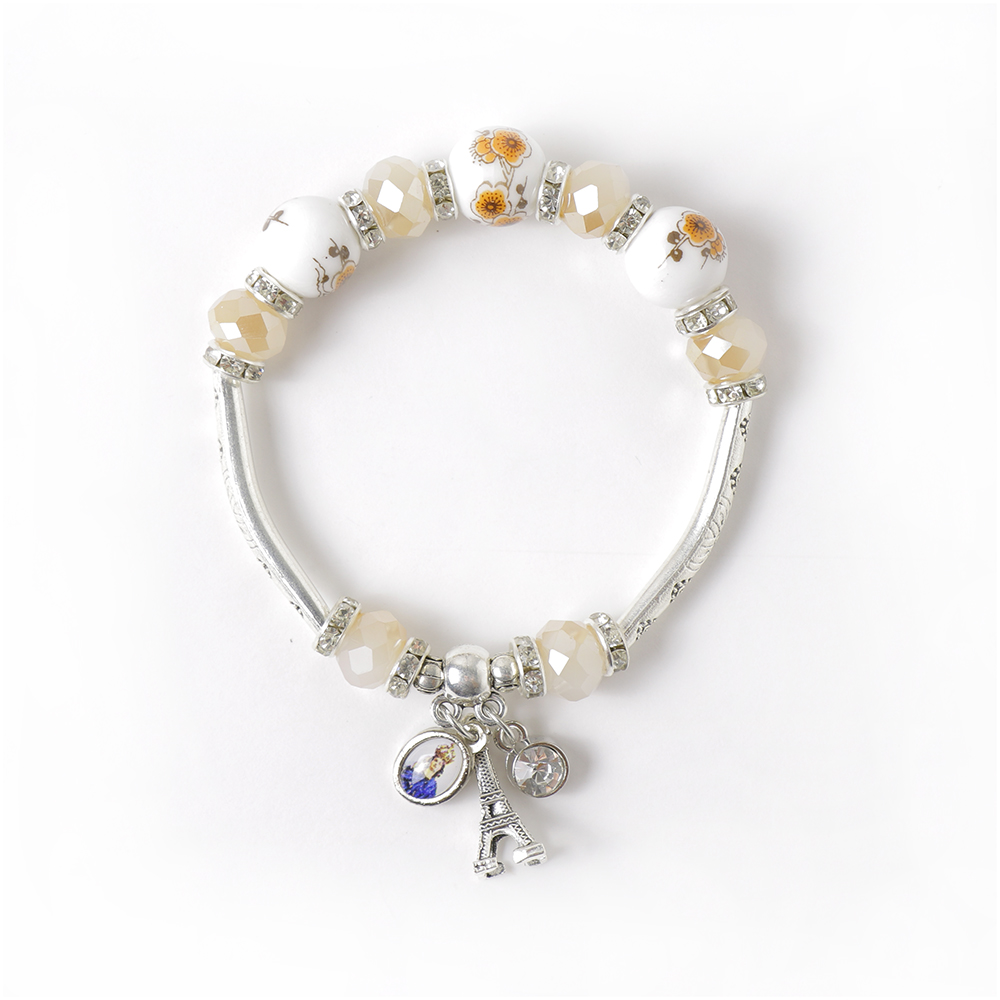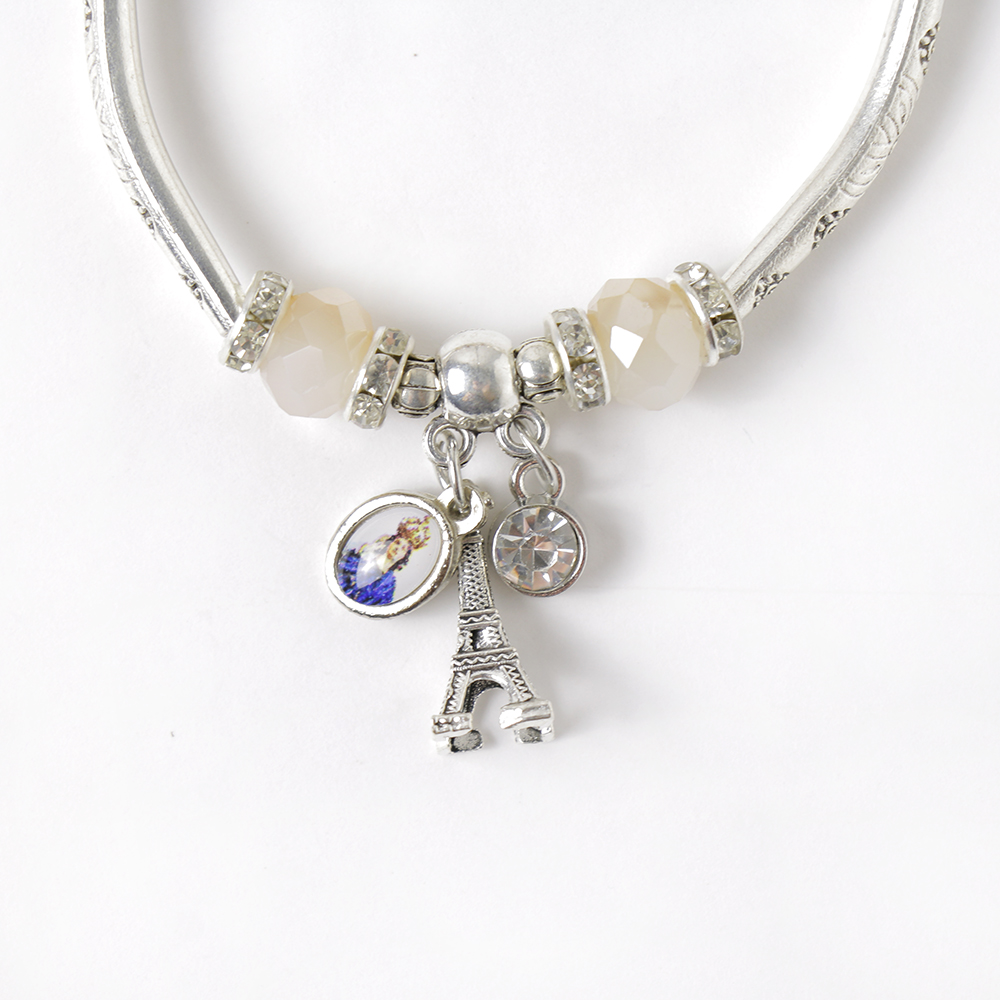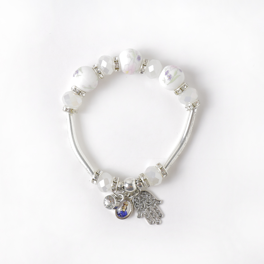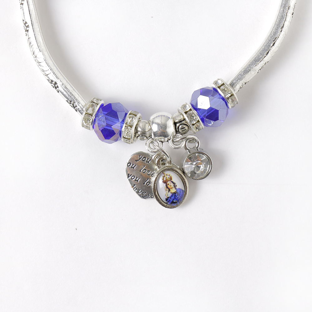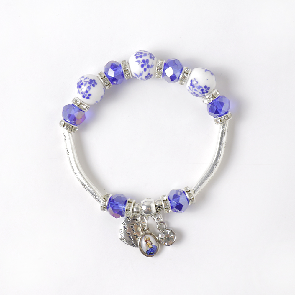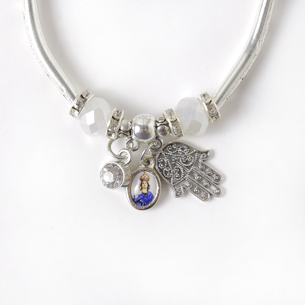 Pulseira com medalha da Nossa Senhora do Sameiro e a mão de Fátima em metal com pedra e brilhantes, disponível em azul, branco e bege.
