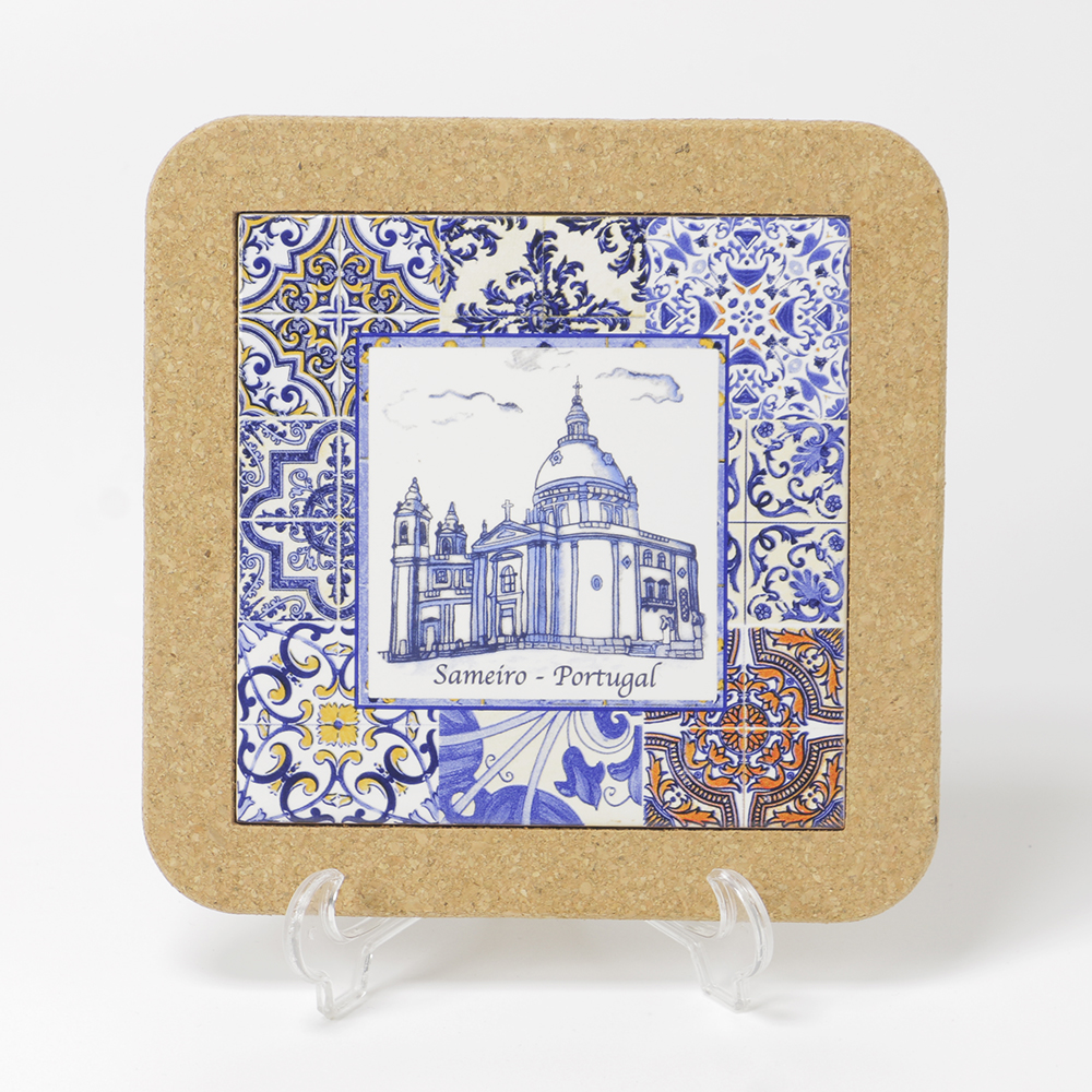Base de cortiça com azulejo e Basílica do Sameiro. Ideal para colocar as suas panelas, serve como base protetora.