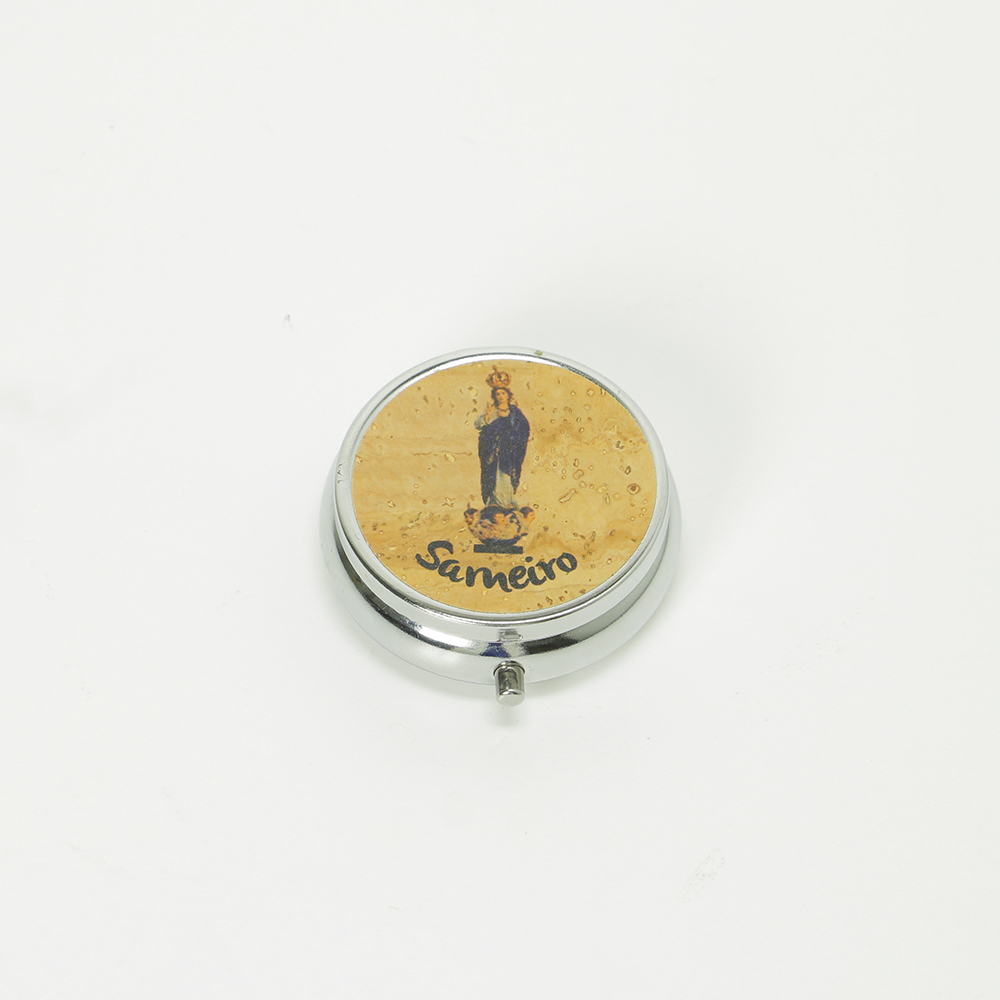 Caixa prateada com imagem da Nossa Senhora do Sameiro, em cortiça para colocar os seus comprimidos diários.