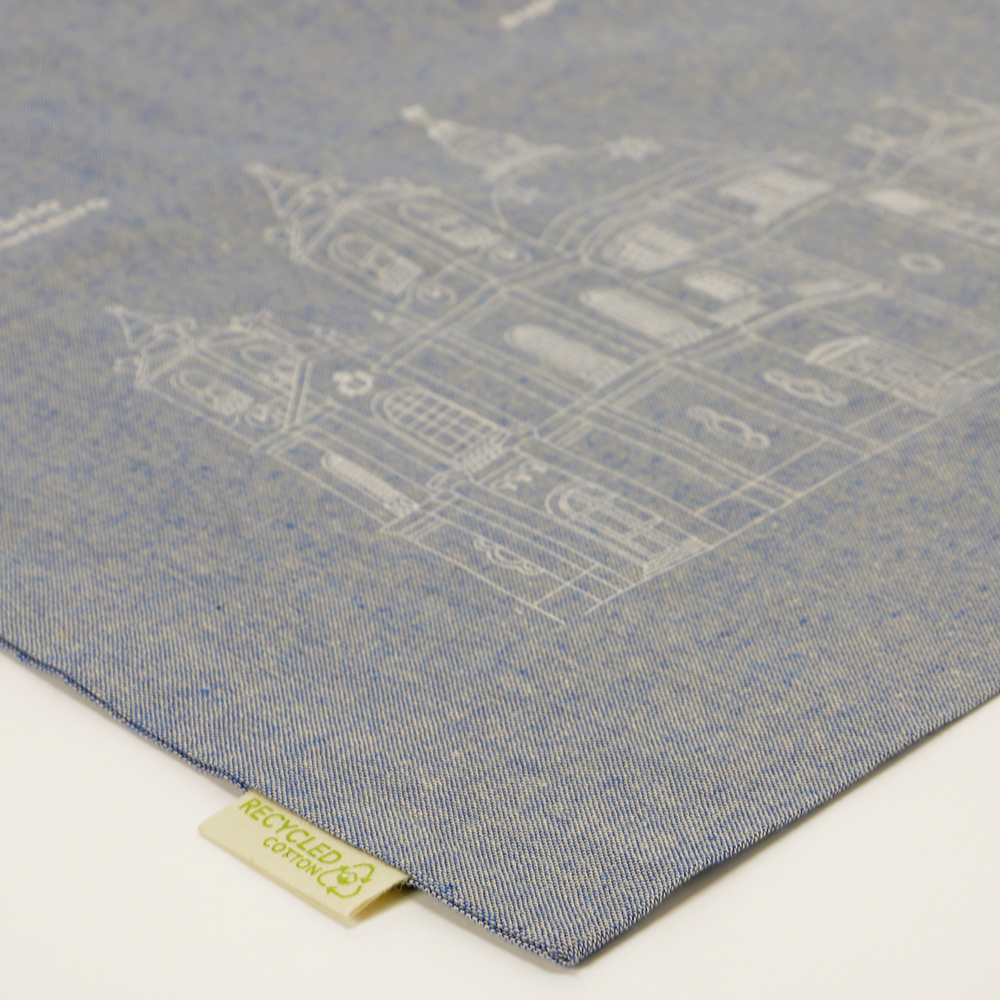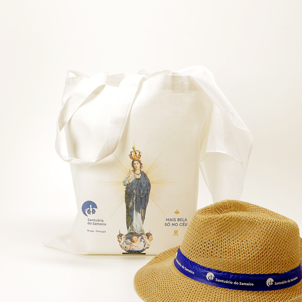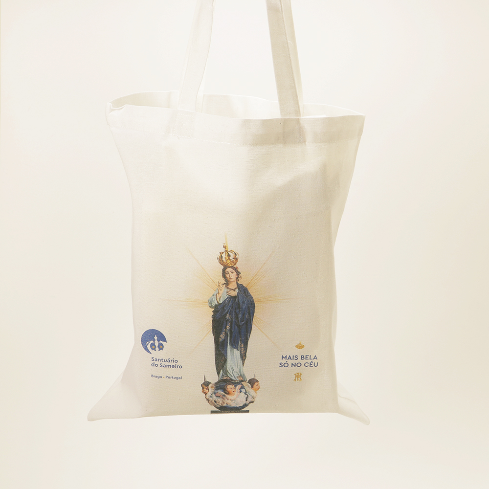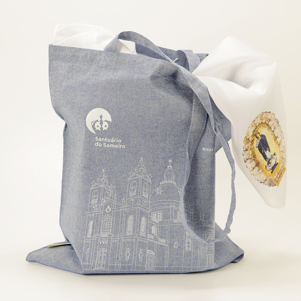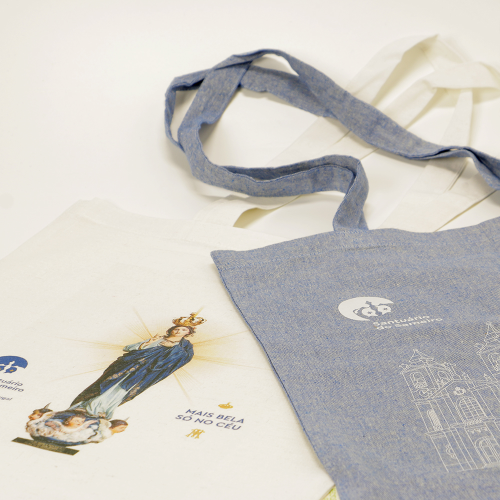 Saco de algodão azul com estampagem do Santuário do Sameiro a branco e saco de algodão branco com estampagem da nossa Senhora do Sameiro a cores, medidas 41x35x41.
