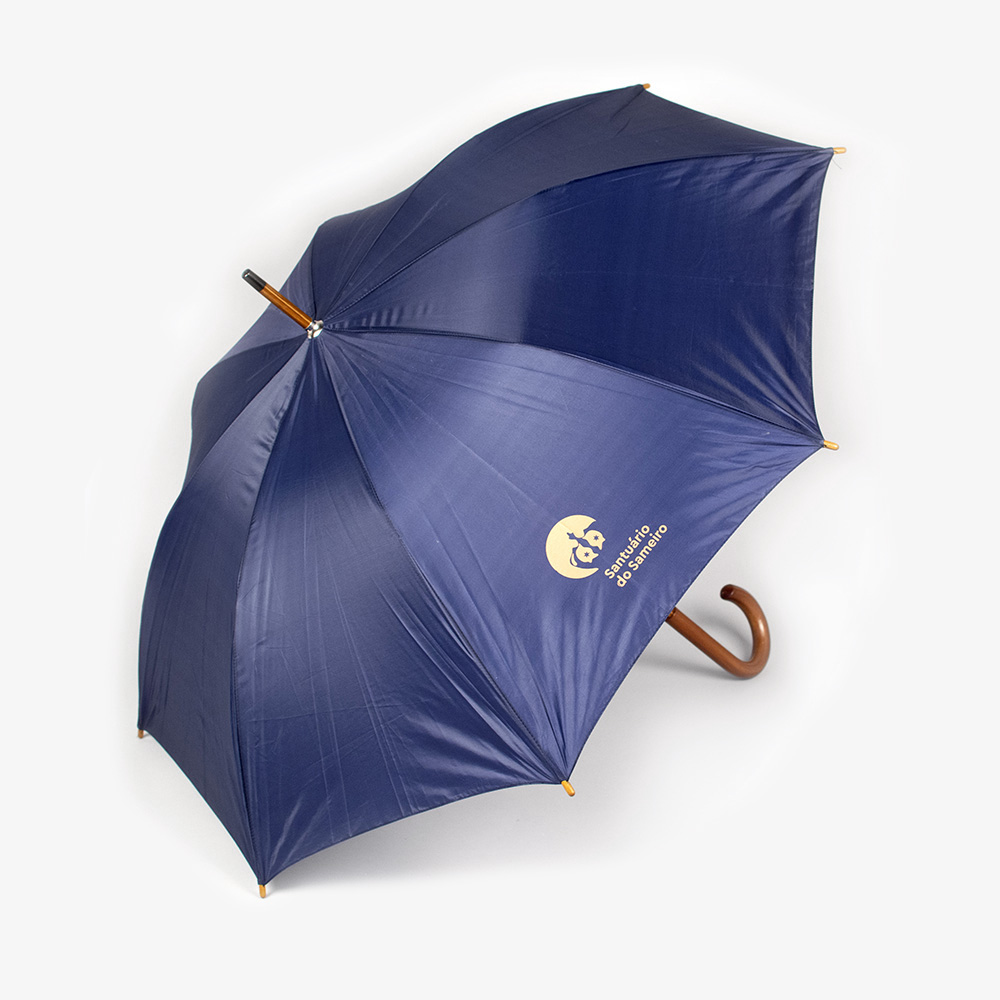 Guarda-chuva  com abertura manual com 8 varetas, de cor azul  escuro, com símbolo do Santuário do Sameiro com cabo de madeira.